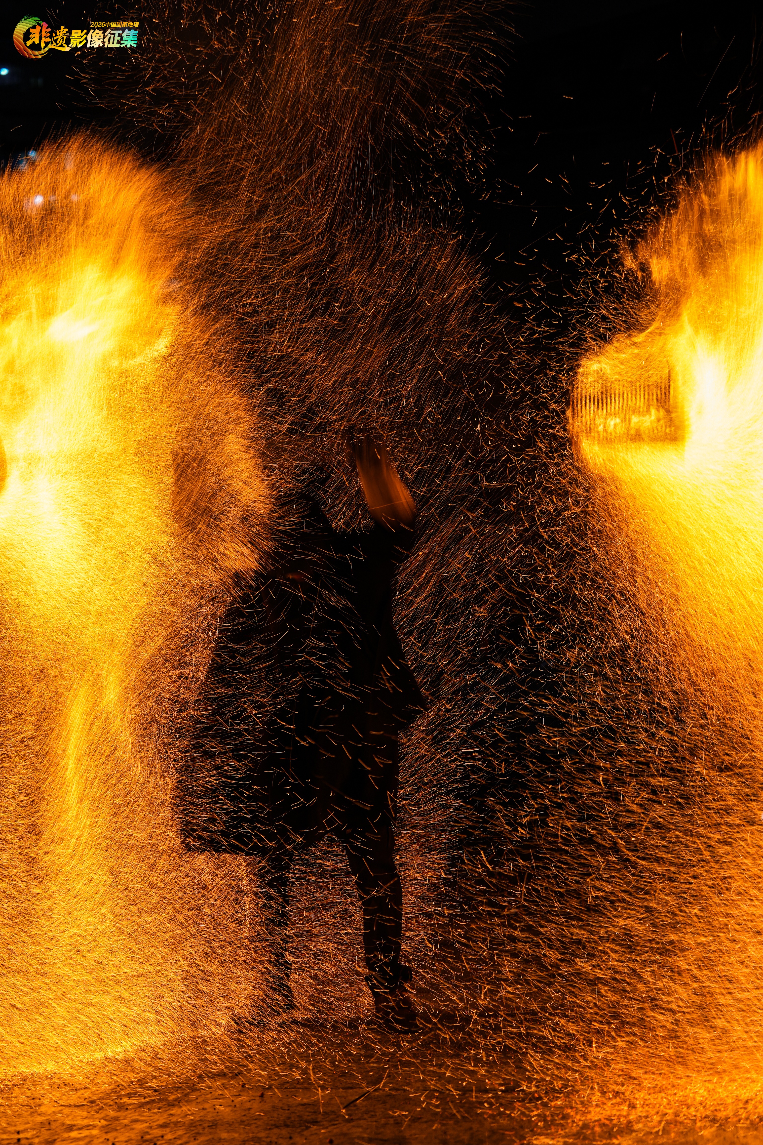 挥臂间,铁花瞬间化作振翅的火羽,滚烫的焰浪像一只浴火的凤凰在黑夜里尽情的展翅!