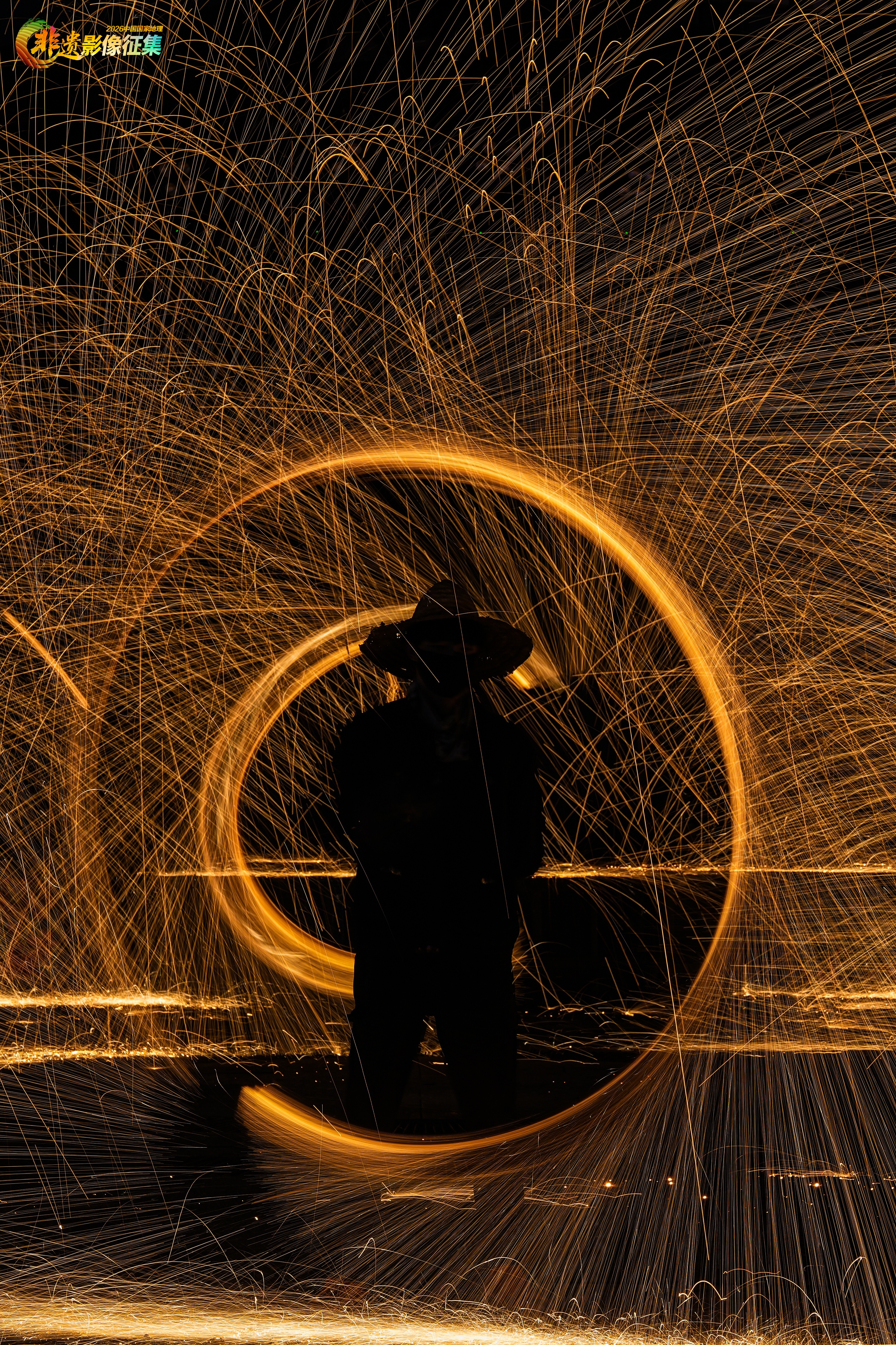 我愿称他为“舞动精灵”,手持火具,火焰在身后旋转成灵动的火蝶,明与暗之间,有种刚柔并济的美感,是焰火与肢体的诗意共舞。