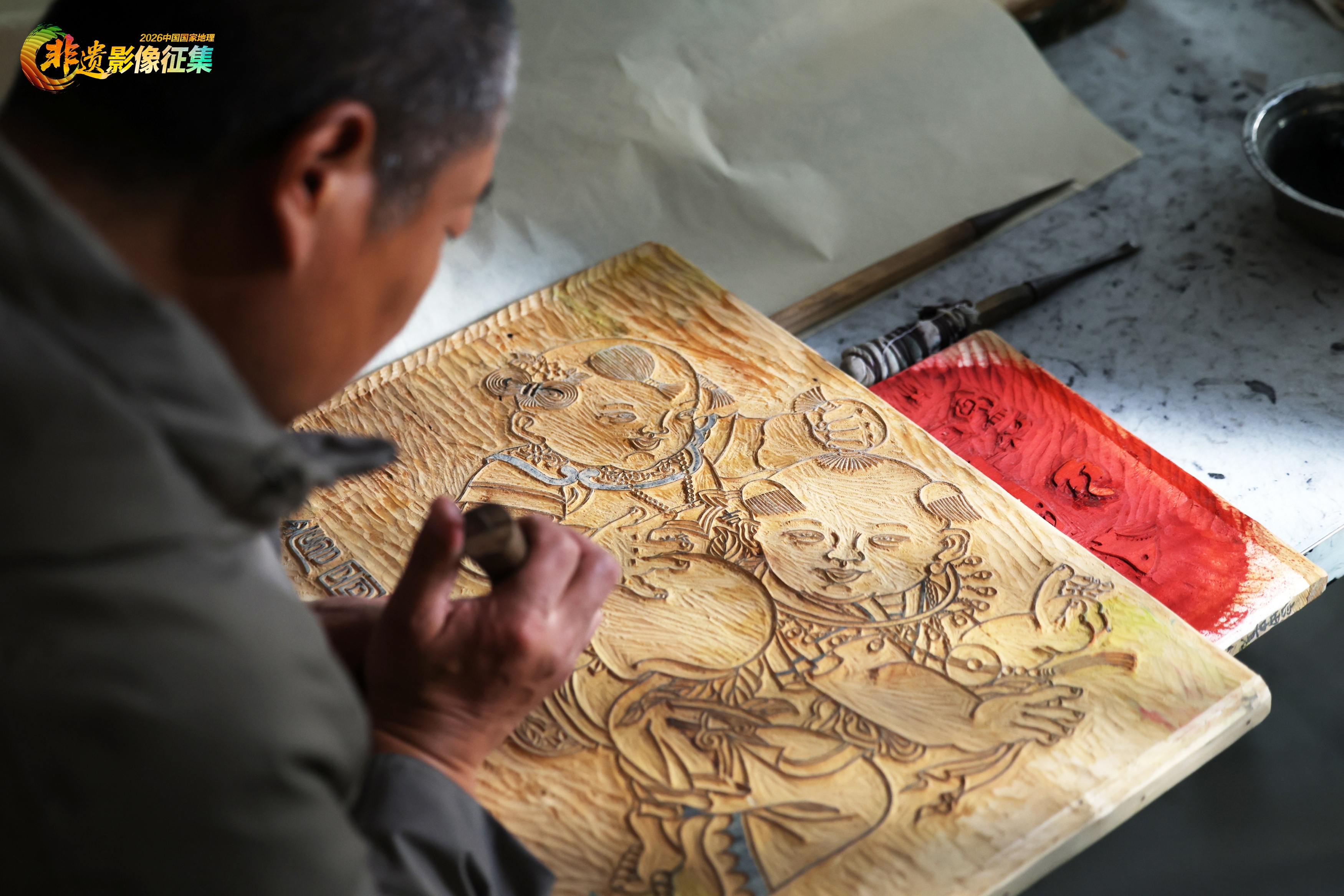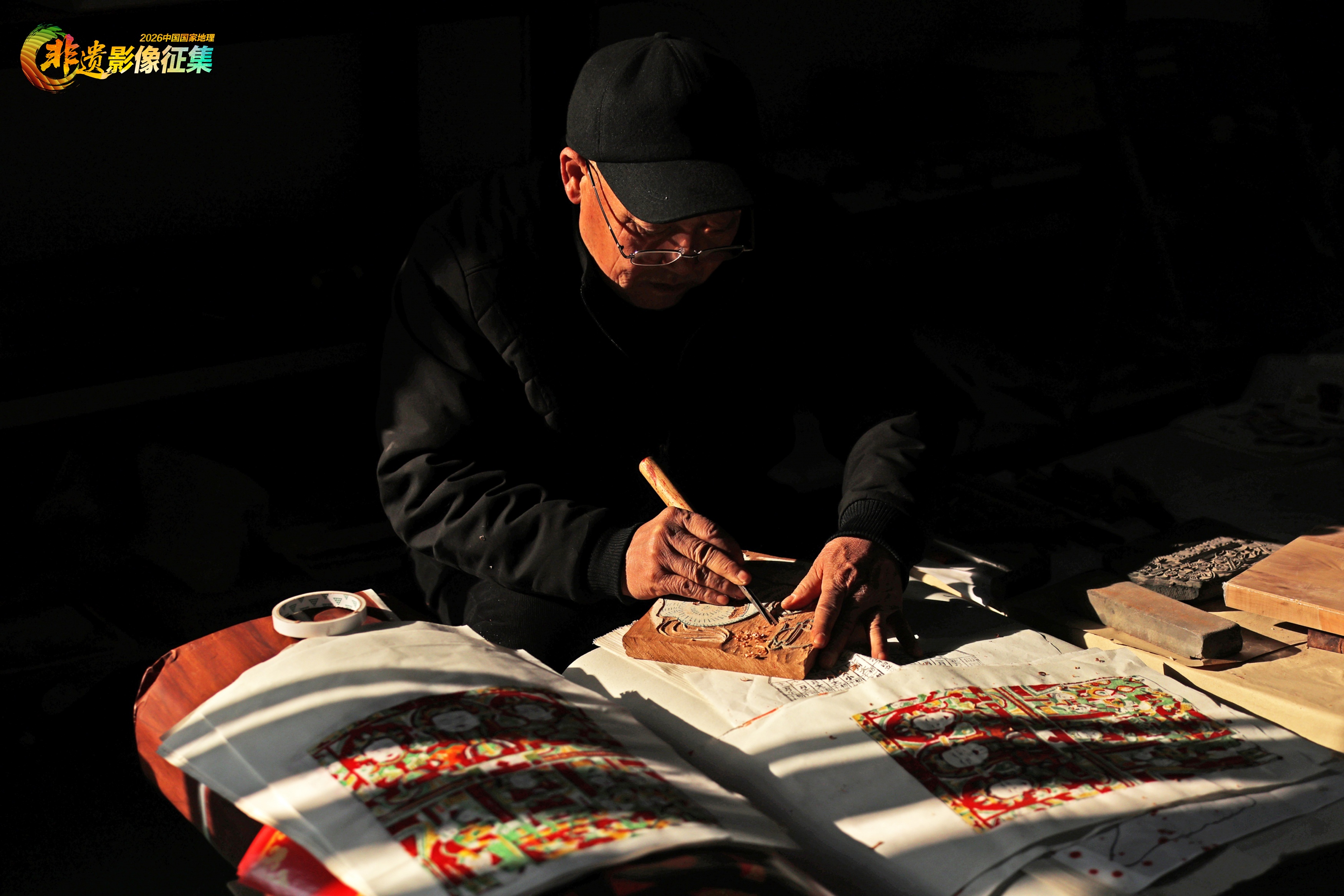 2026年2月2日,山东省临沂市郯城县郯城街道木版年画制作艺人孙宪喜正在木板年画雕刻印板。