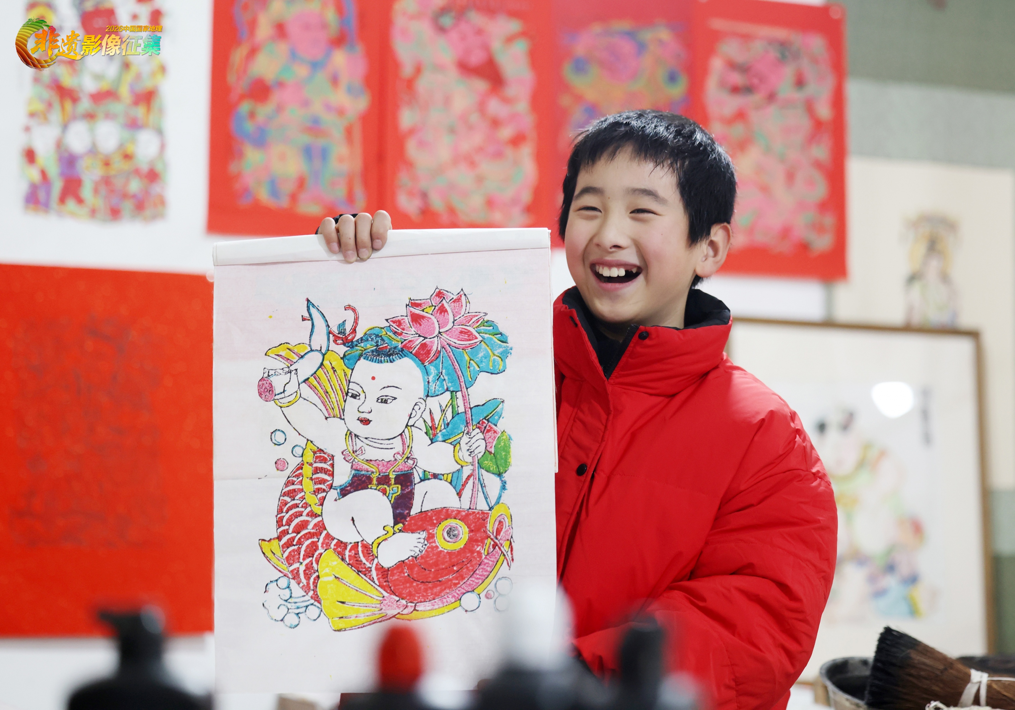 2026年2月2日,山东省临沂市郯城县郯城街道一名小男孩展示木版年画。