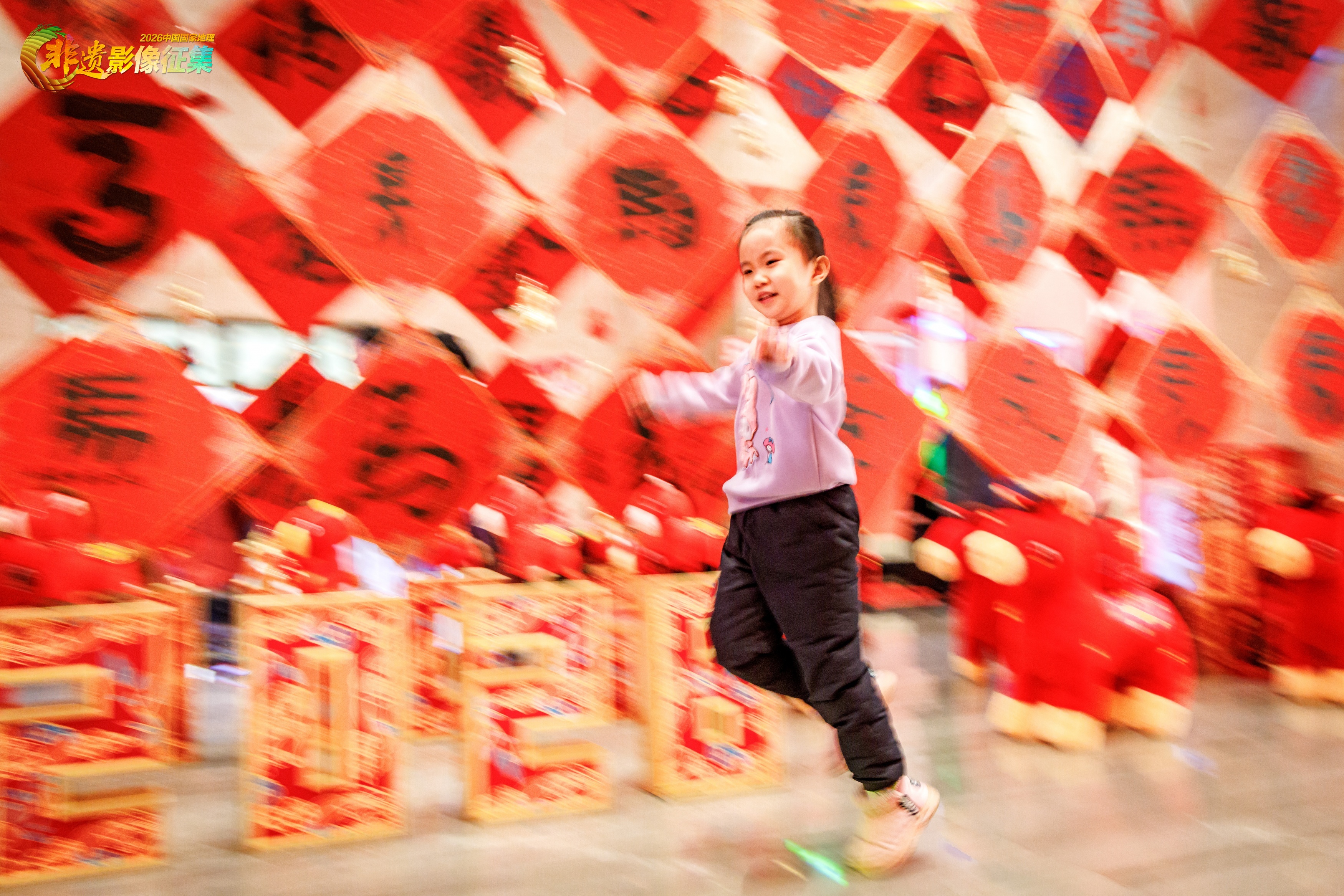 2026年3月3日拍摄于新疆克拉玛依市,元宵游园集市活动上、一个小姑娘从挂满红幅的书法墙前飞奔而过。