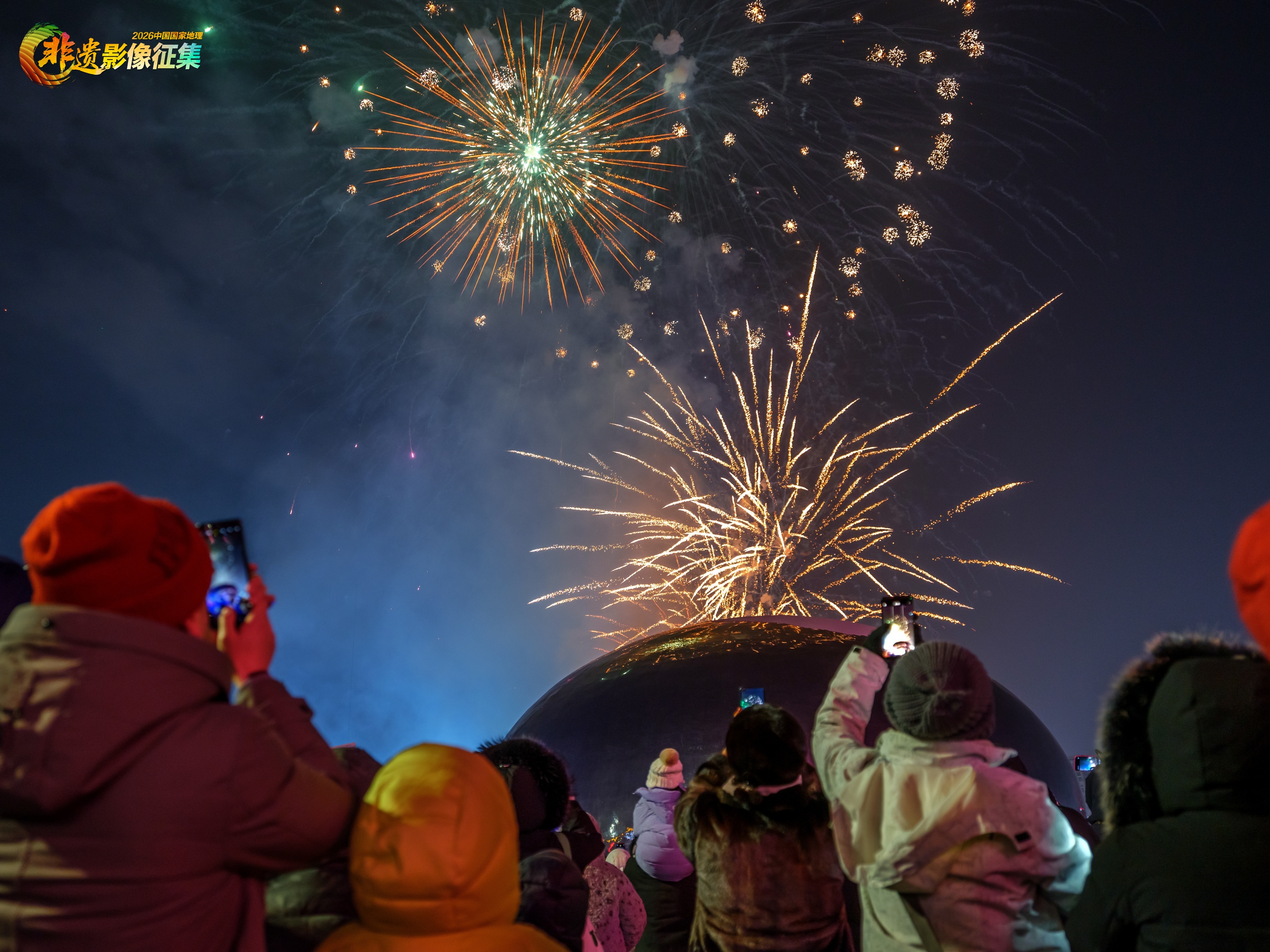 2025年拍摄于新疆克拉玛依市,跨年夜,市民们在克拉玛依地标大油泡欣赏璀璨的烟花。