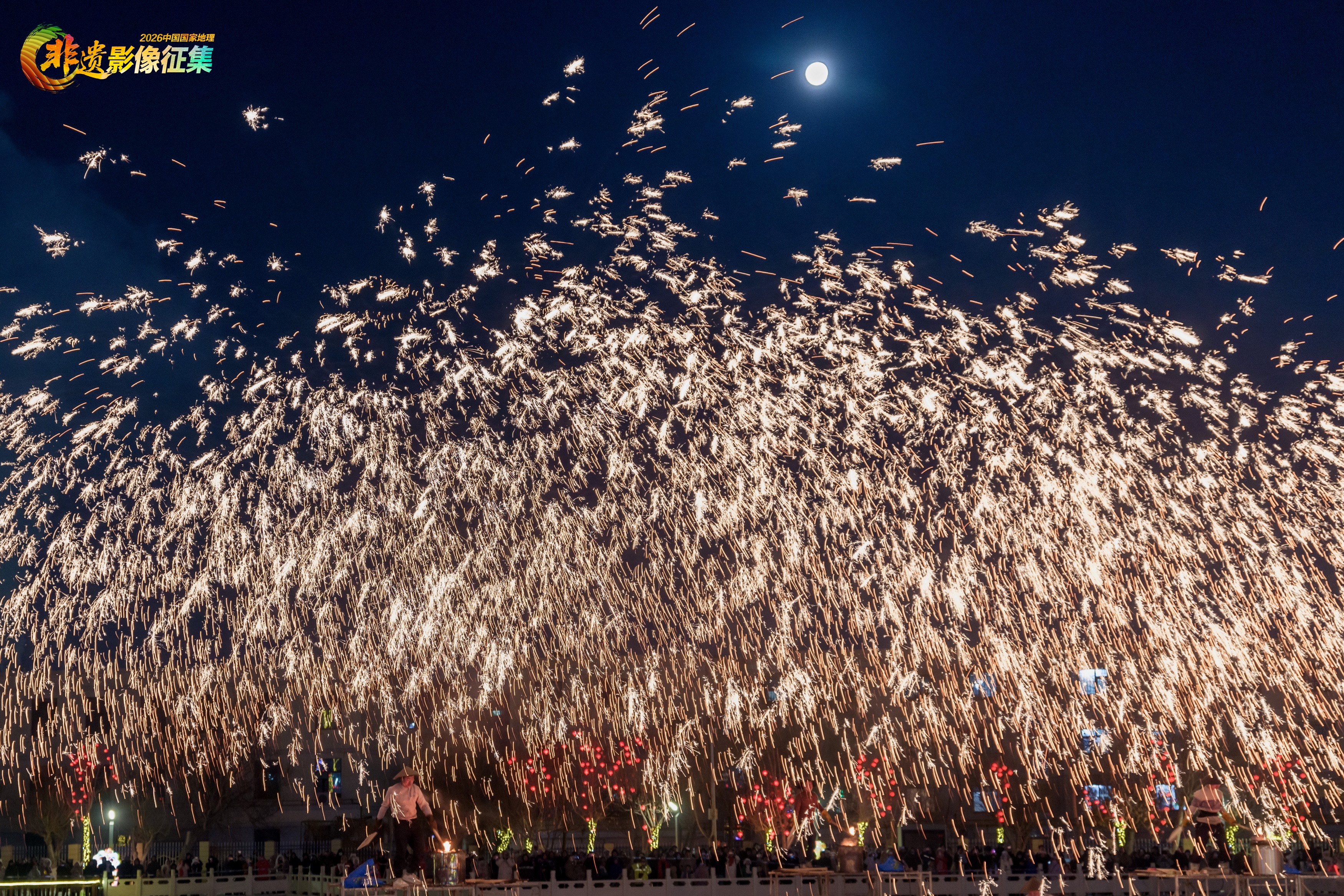 2025年2月12日摄于新疆克拉玛依,正月十五元宵节,璀璨的打铁花表演与皎洁的明月相映成辉。