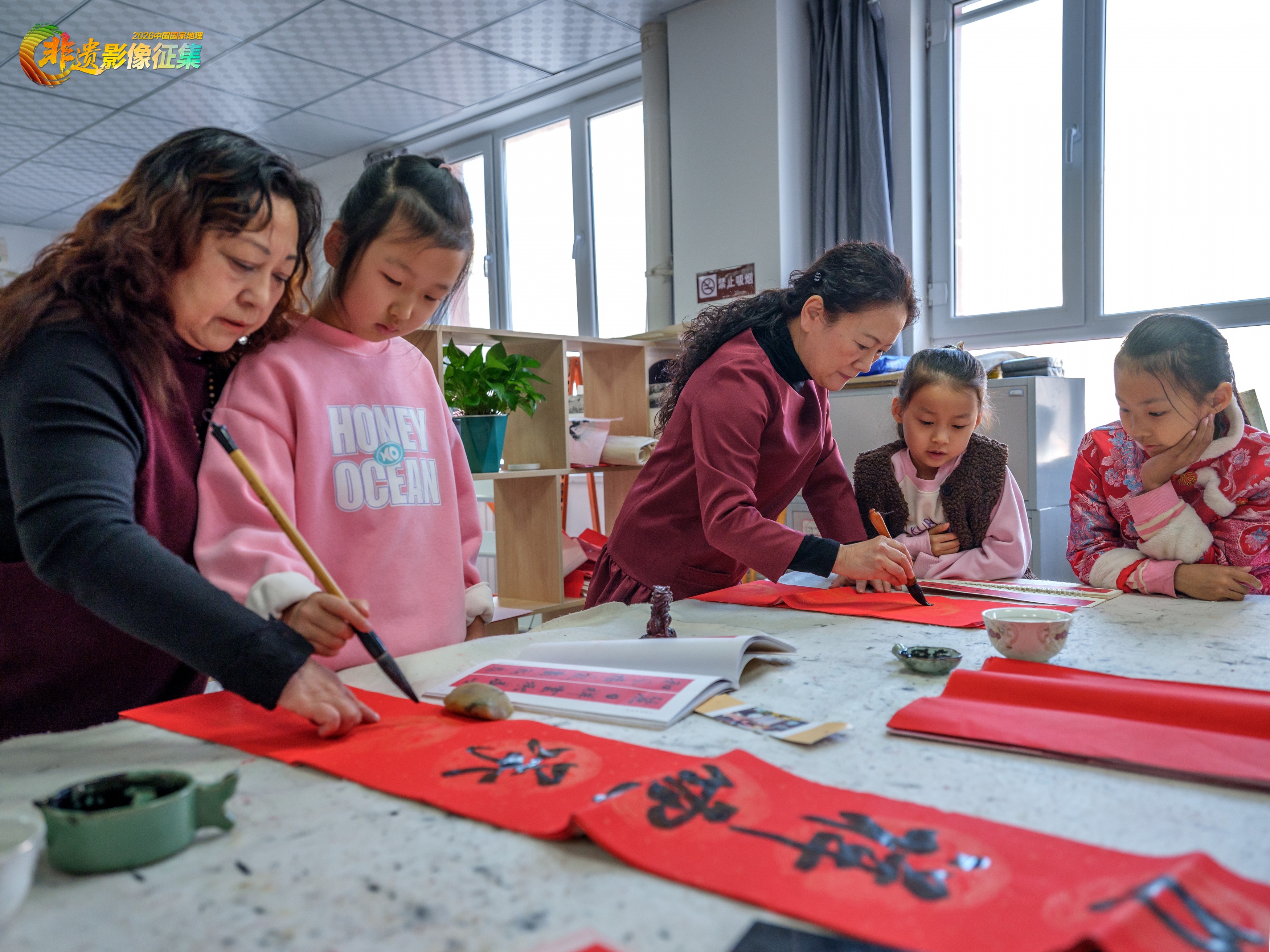 拍摄于新疆克拉玛依市,在春节即将来临之际,社区组织放寒假的学生向书法老师学习写春联、为社区居民送祝福。