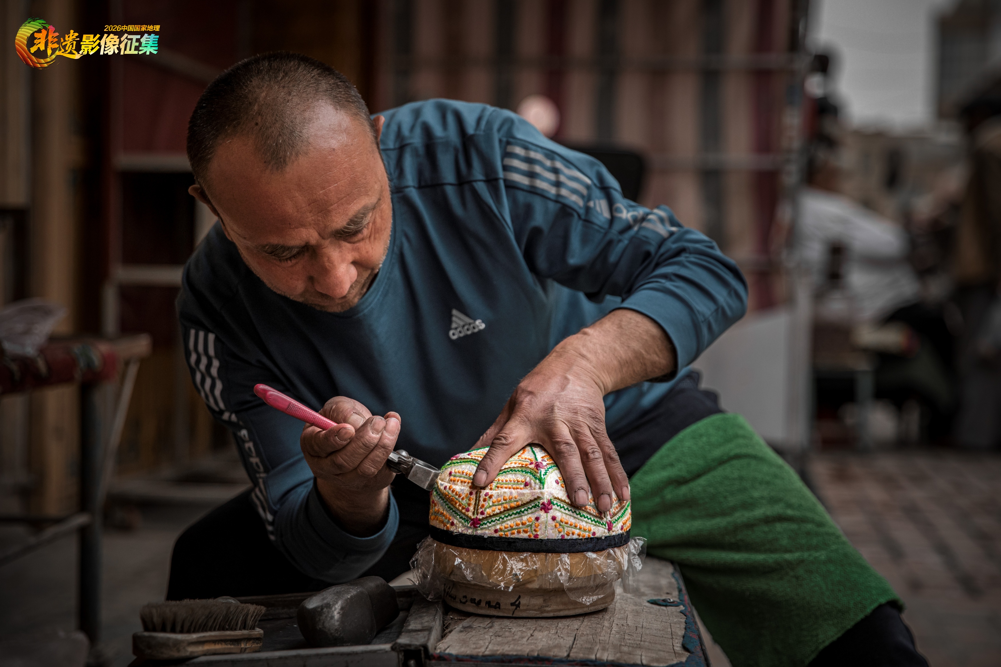 新疆喀什老街有一批维吾尔族花帽手工制作艺人,他们在老街的店铺一边现场制作,一边售卖买,浓郁的民族特色花帽不仅满足了当地居民的生活需要,同时还吸引了外地游客,或驻足观看、或购买留念。