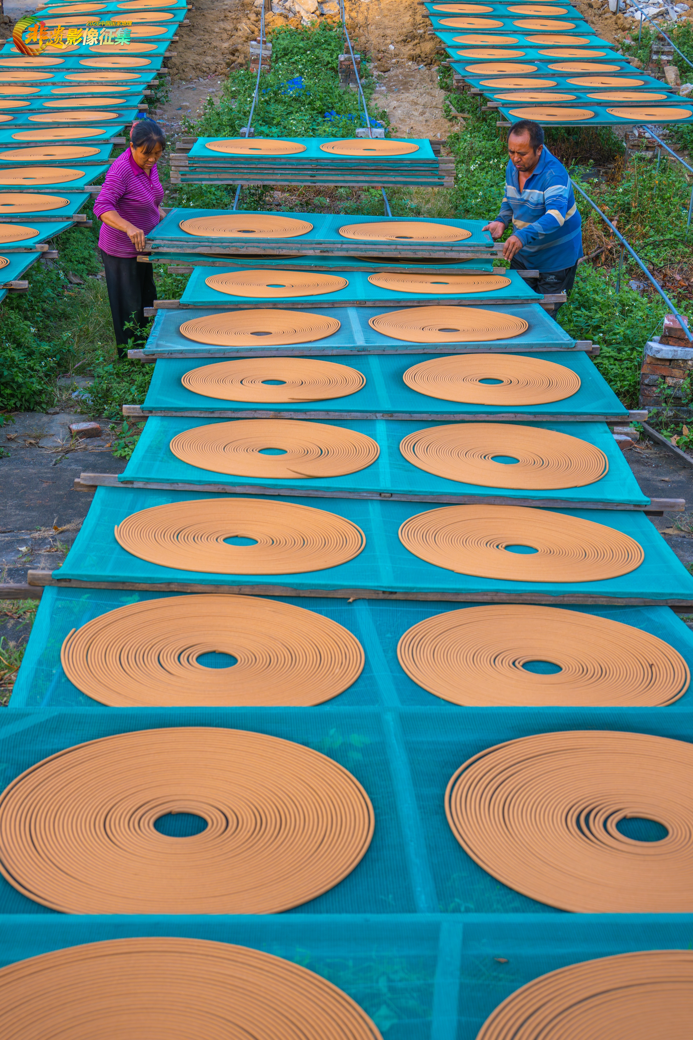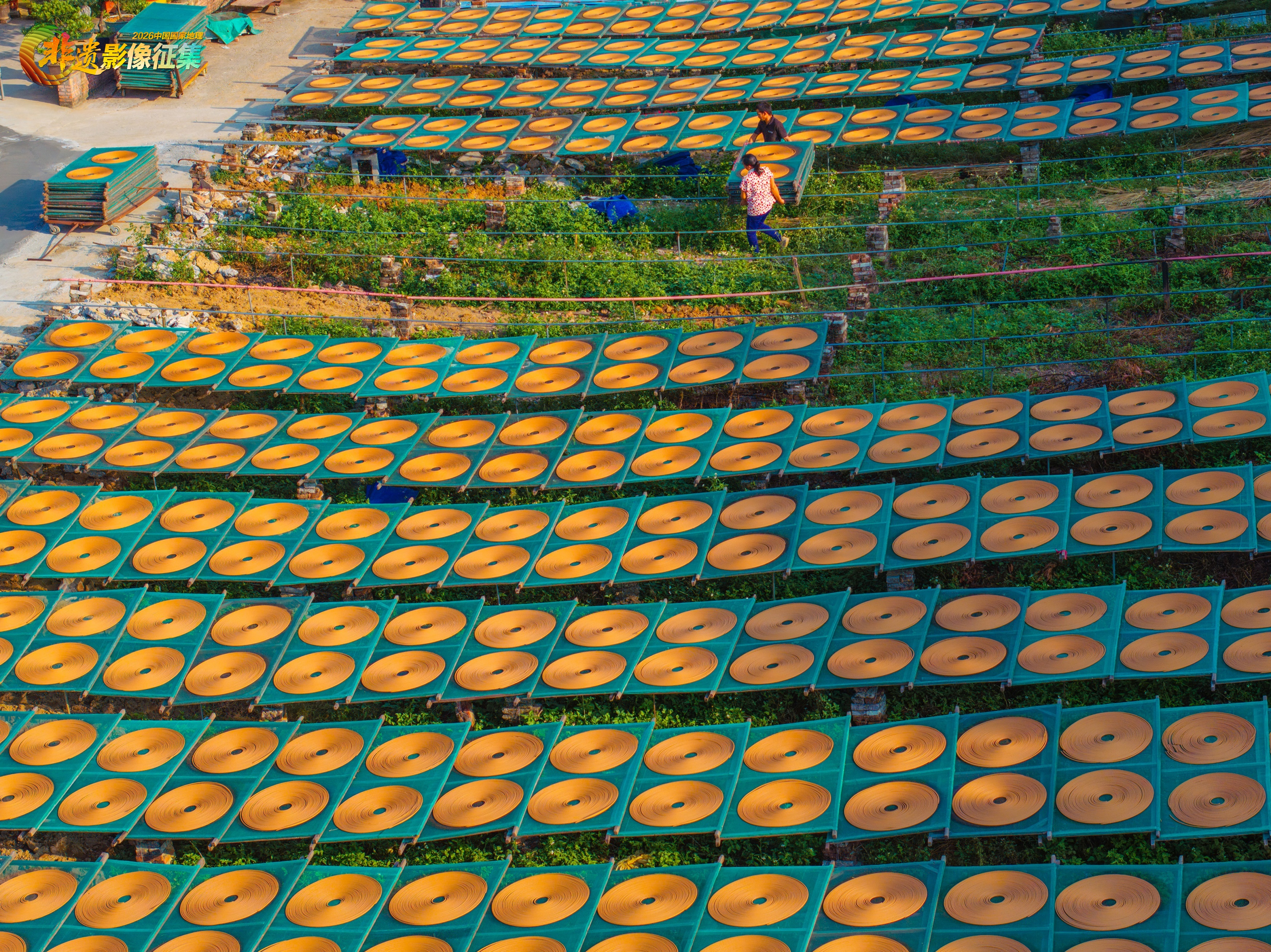 香厂的晒场。在香厂的晒场上,一片片塔香晾晒在特制的架子上,犹如一只只黑胶唱片,低声吟唱着岁月之歌。