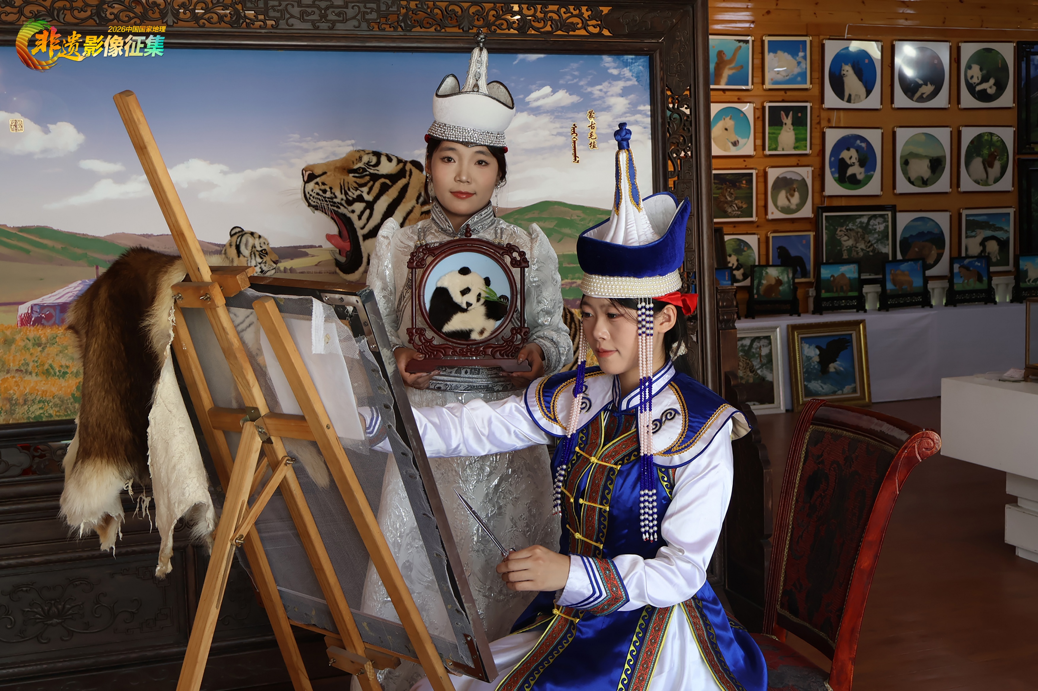 察哈尔毛绣是内蒙古国家级非遗技艺,以天然动物毛发为原料,纯手工绣制。作品记录青年传承人创作熊猫毛绣的瞬间,展现草原非遗与国宝文化的融合,彰显传统技艺在当代的传承与新生。