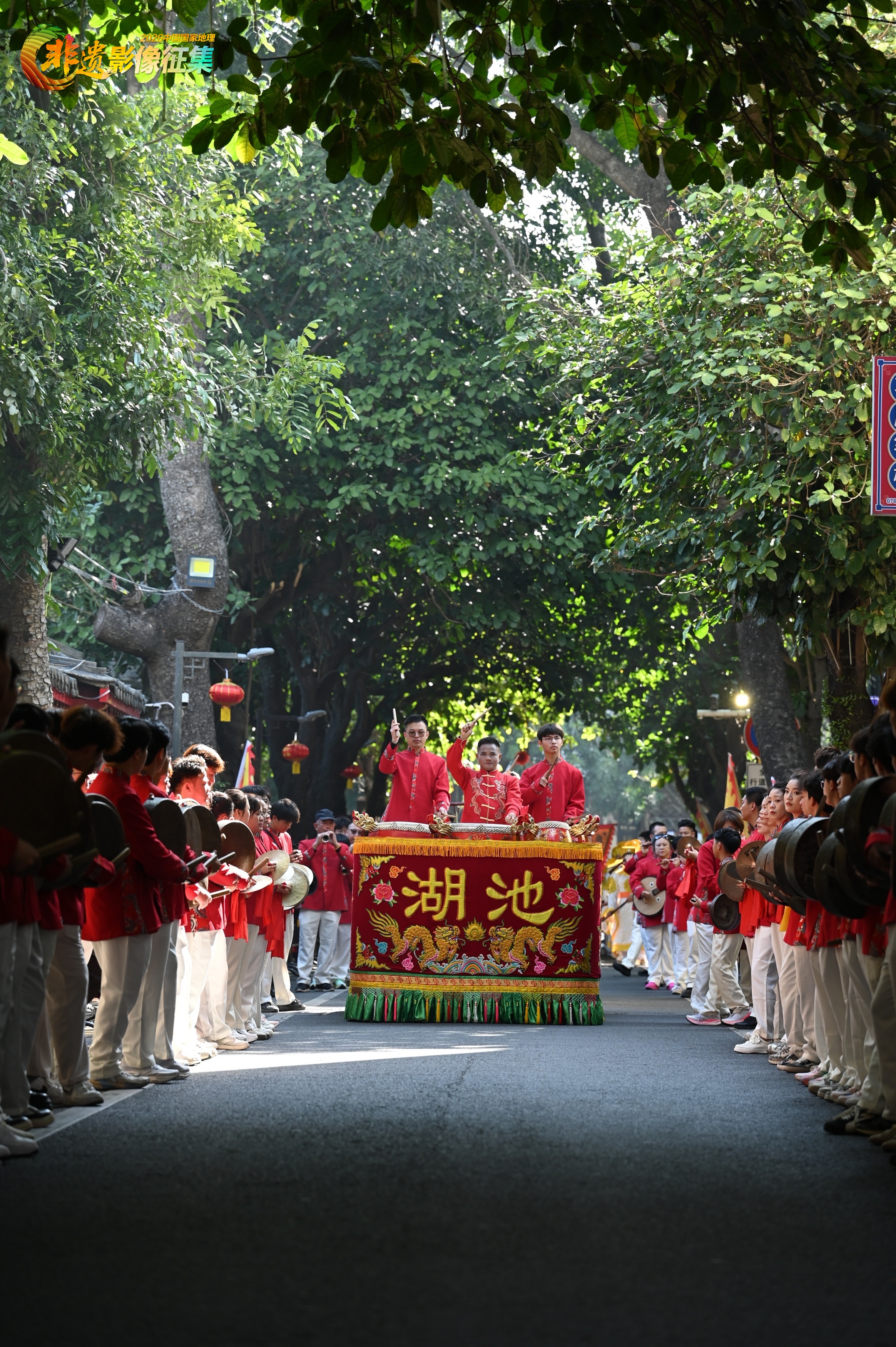该影像定格了广东潮汕地区“营老爷”仪式中,最震撼人心的国家级非遗——潮汕大锣鼓表演瞬间。画面中心“池湖”绣屏由鼓手领衔,两侧锣手严整待发。在潮汕,锣鼓声不仅是节庆的背景音,更是连接族群、祭祀神明、振奋民心的图腾。 该照片捕捉了锣鼓队行进中的肃穆与力量。画面中心的主鼓手高举鼓槌,不仅是节奏的掌控者,更是整支巡游队伍的灵魂。两侧密集的锣阵形成了视觉的延伸,展示了大锣鼓这一艺术形式规模宏大、气势磅礴的特征。两侧由青少年组成的锣手队伍,身着统一的红色传统服饰,体现了非遗技艺在潮汕乡村“代代相传、不断层”的鲜活现状。