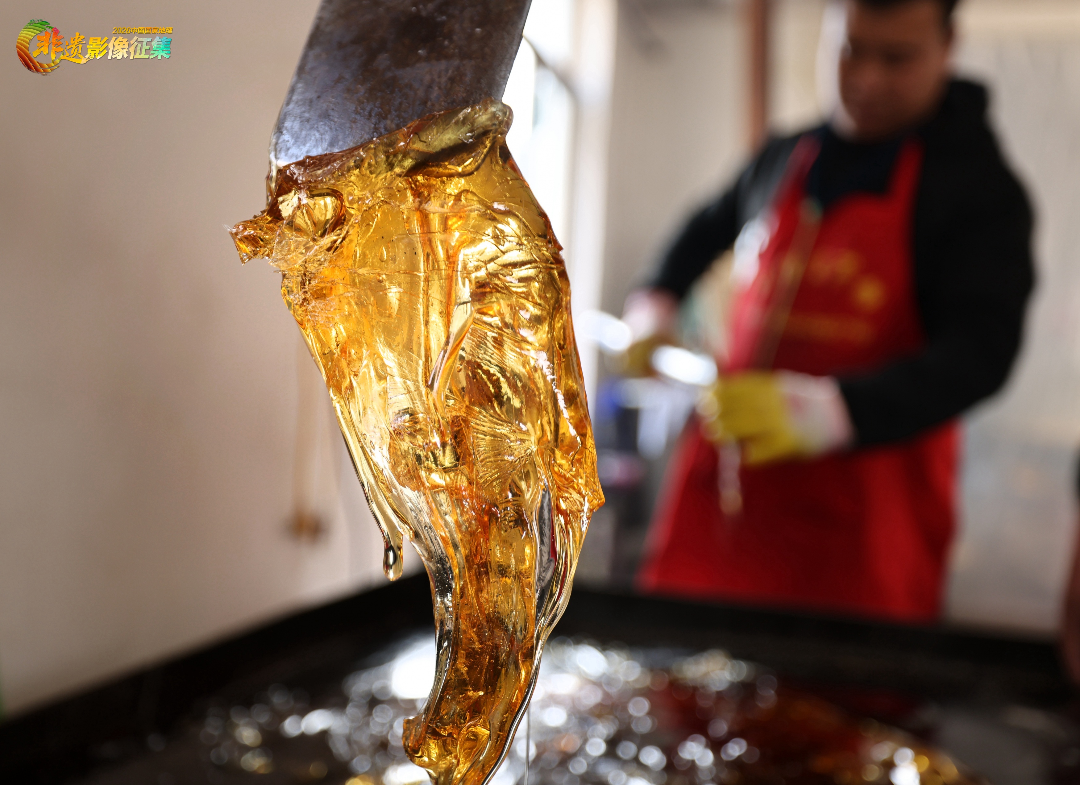 2023年1月14日,在山东省聊城市高唐县清平镇小屯村糖瓜加工现场,非遗传承人刘修良将熬好的麦芽糖降温。