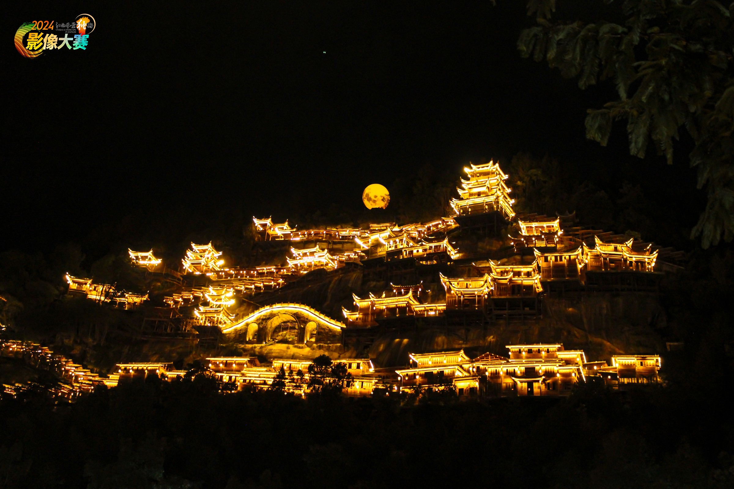 望仙谷在夜晚灯光的映照下显得格外璀璨,建筑层层叠叠依山而建,在明月的烘托下,整个场景如同天上的宫殿一般。如梦如幻、超凡脱俗的景致,仿佛这里就是仙人居住的宫阙。