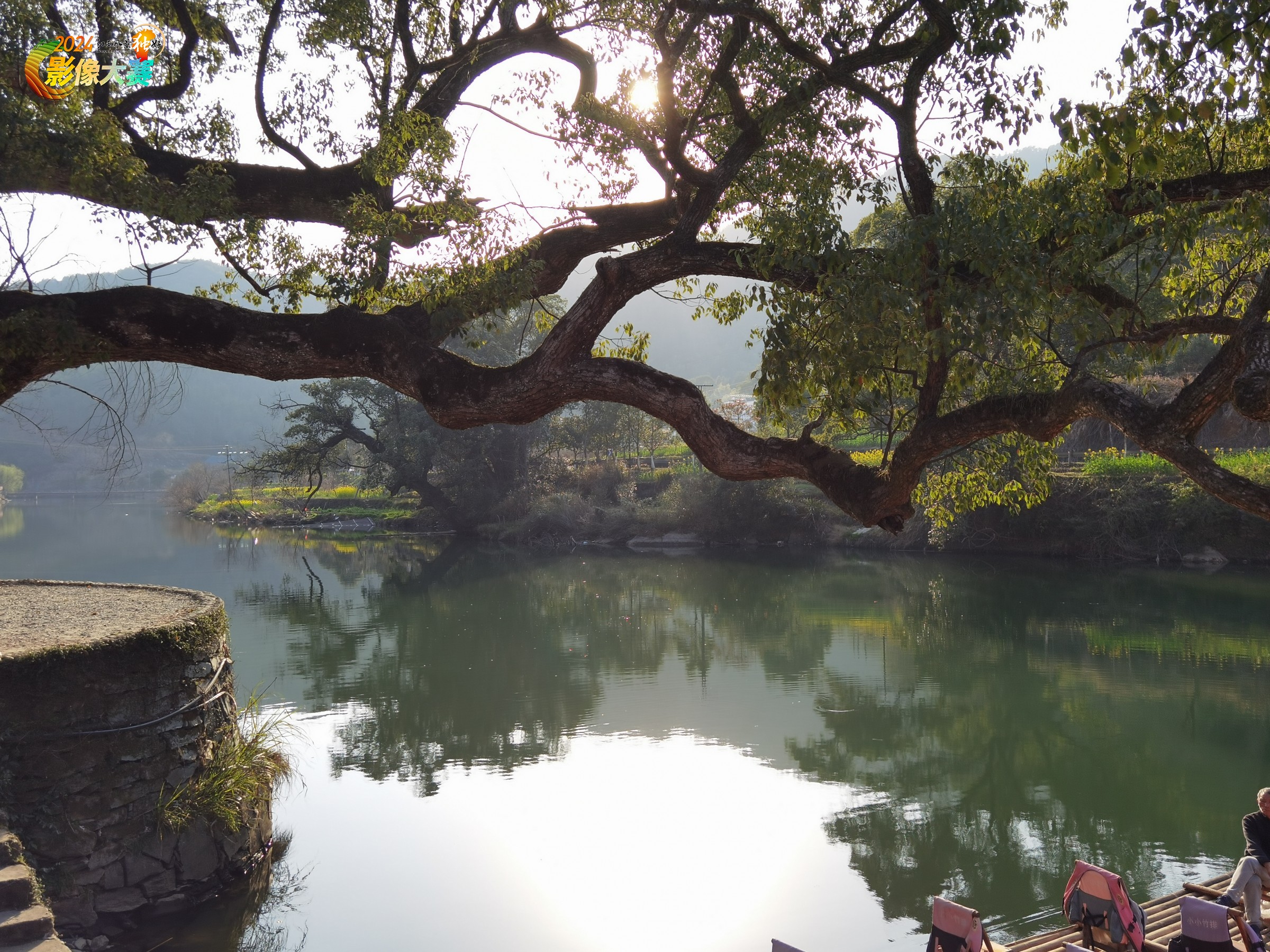 过了桥,往右手边走,走到尽头可见一棵古老的樟树,其“躯干”向外凹,仿佛要斜卧在水面一般,那“凌空”在水面上的枝干,在阳光的照耀下,显得分外妖娆。