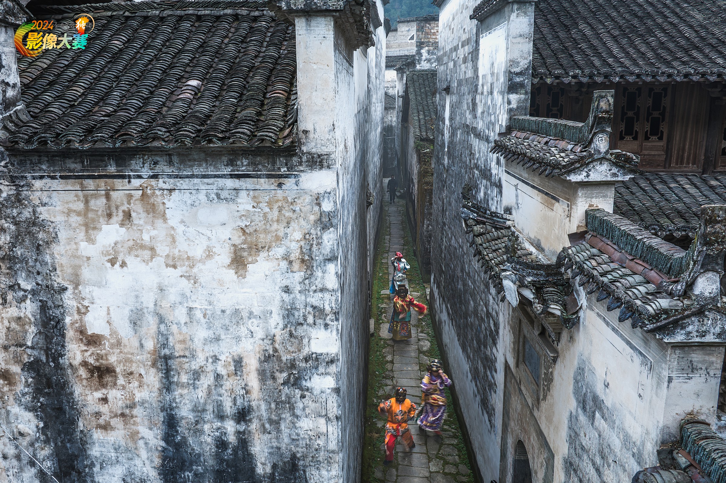 在徽派古建筑环绕的小巷中,傩舞者们面戴各式面具,身形律动,仿若从岁月深处走来的神秘使者,唤醒了小巷的灵魂。