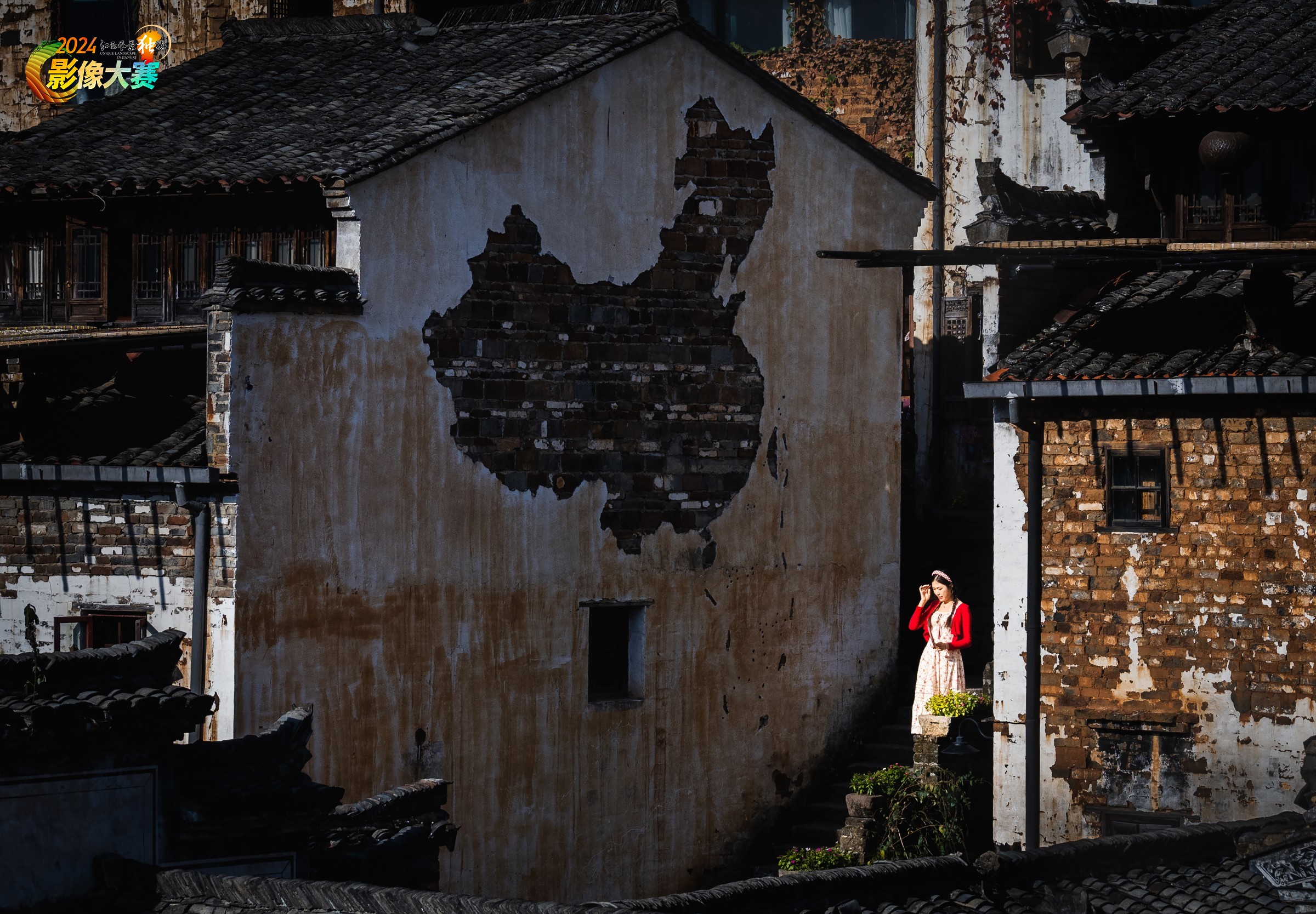 在篁岭中国地图墙旁,一位红衣少女如灵动的火焰般轻盈走过,似一幅色彩明艳的画卷。