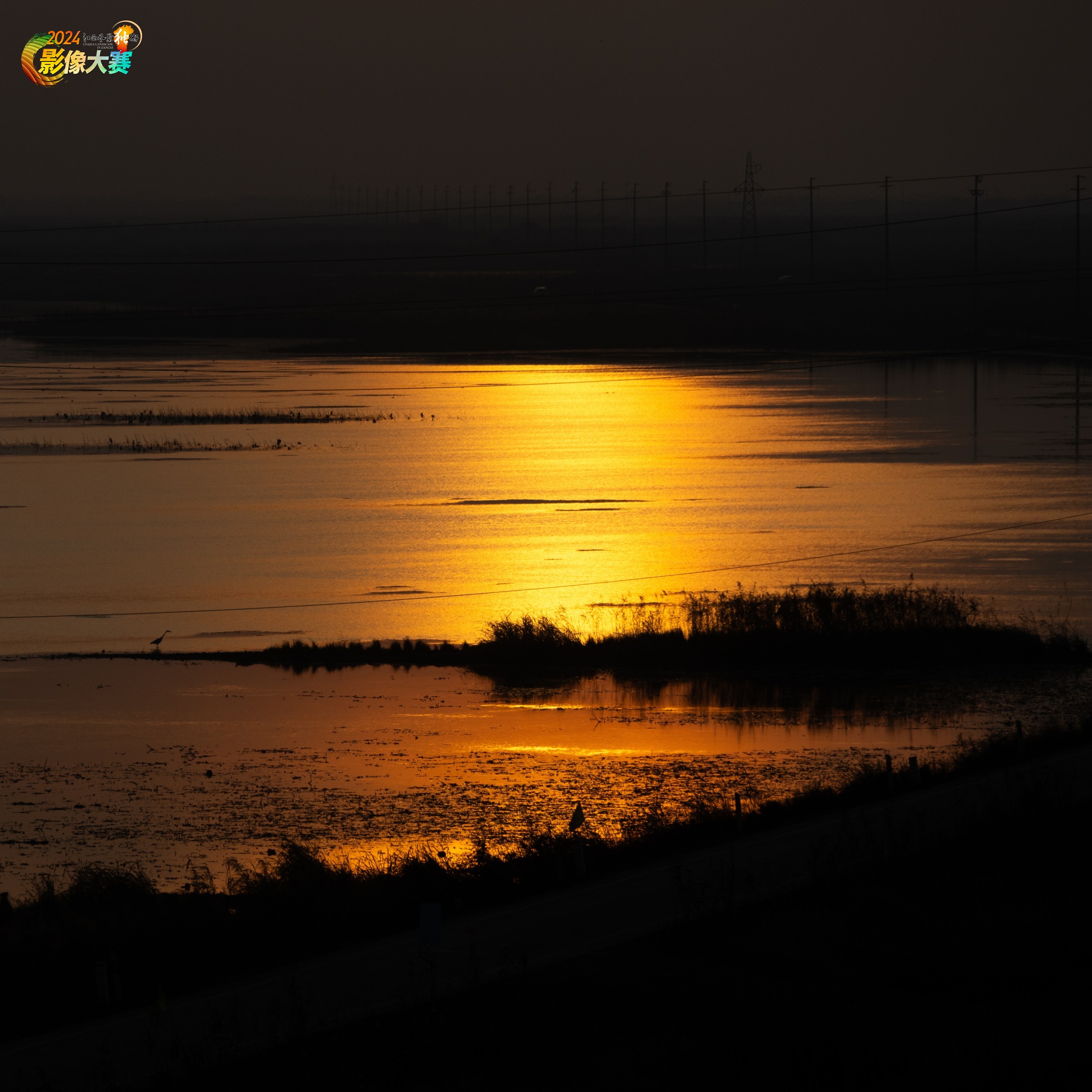 照片于2023年12月14日在江西南矶山自然保护区拍摄,这里属于鄱阳湖西南湖域。拍摄时太阳正向着地平线下徐徐下落,它金色的余晖正好照映在湖面,湖面泛起金色的涟漪,光彩耀人。