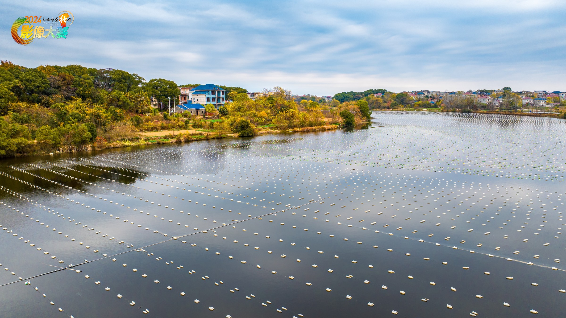 金色的村庄旁边,水产养殖场倒映着蓝天白云,一派丰收景象。