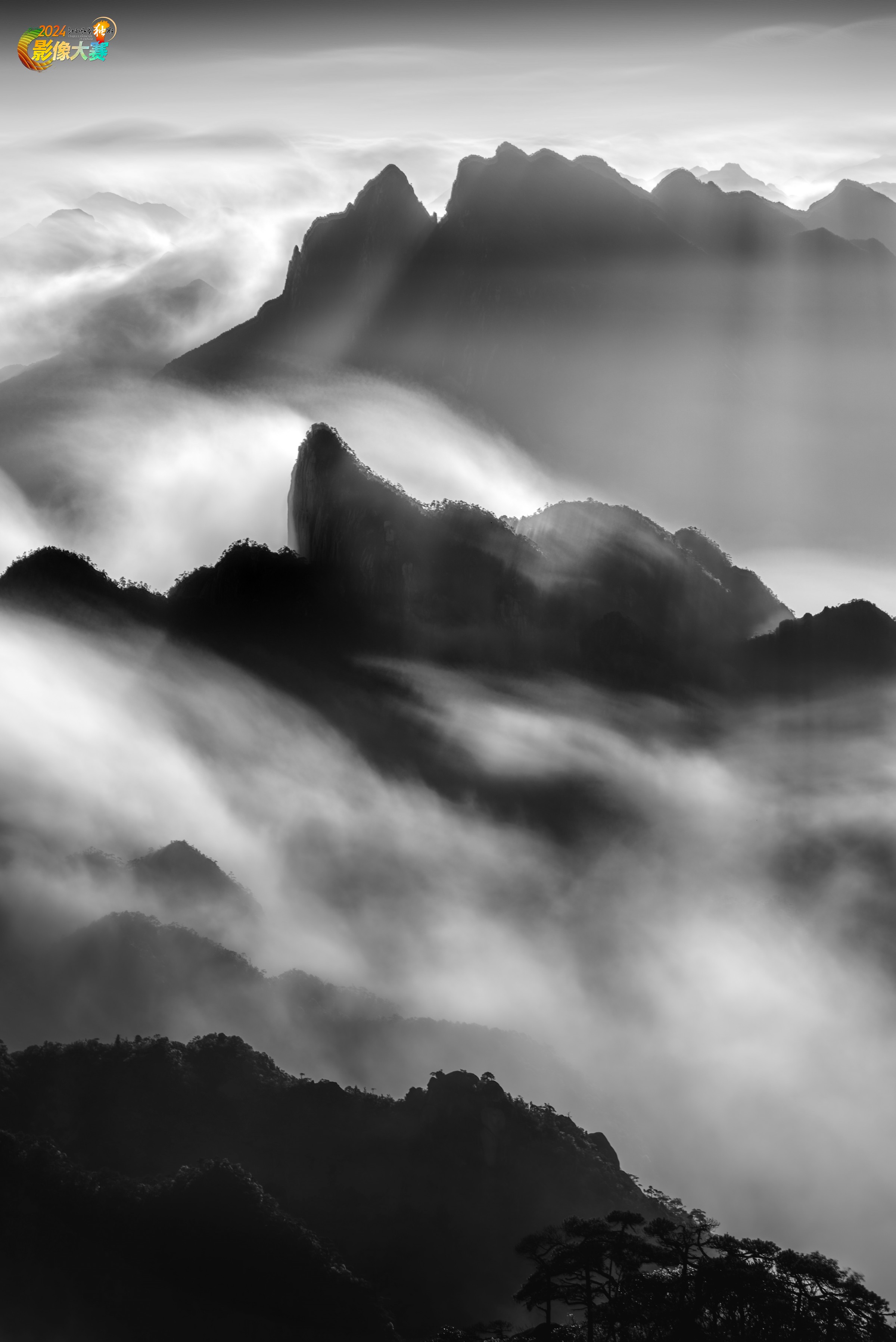 三清山 山峦之间一层层云雾如潮水般涌动 时而如瀑布般倾泻而下 时而如江河般奔腾不息 仿佛是一幅水墨山水画 充满了诗意