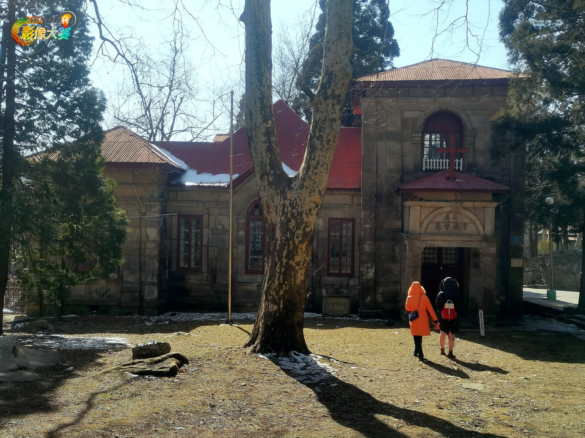 两位游客寻访庐山基督教堂的背影,与阳光下的树影构成饶有趣味的图案。