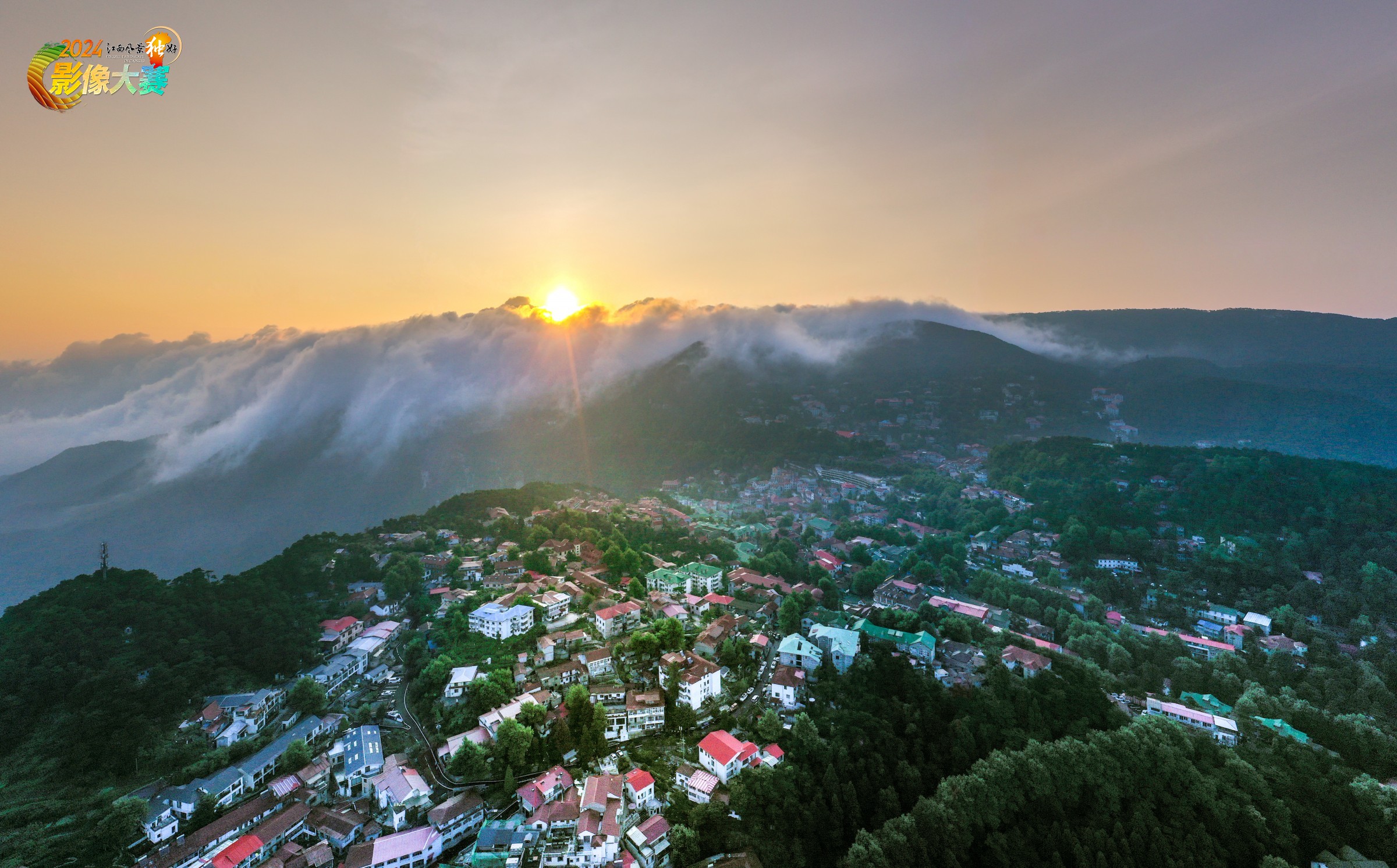 清晨的庐山牯岭镇,远山的云海气势磅礴,初出的晨光洒在牯岭镇带着些许冷意的小楼上
