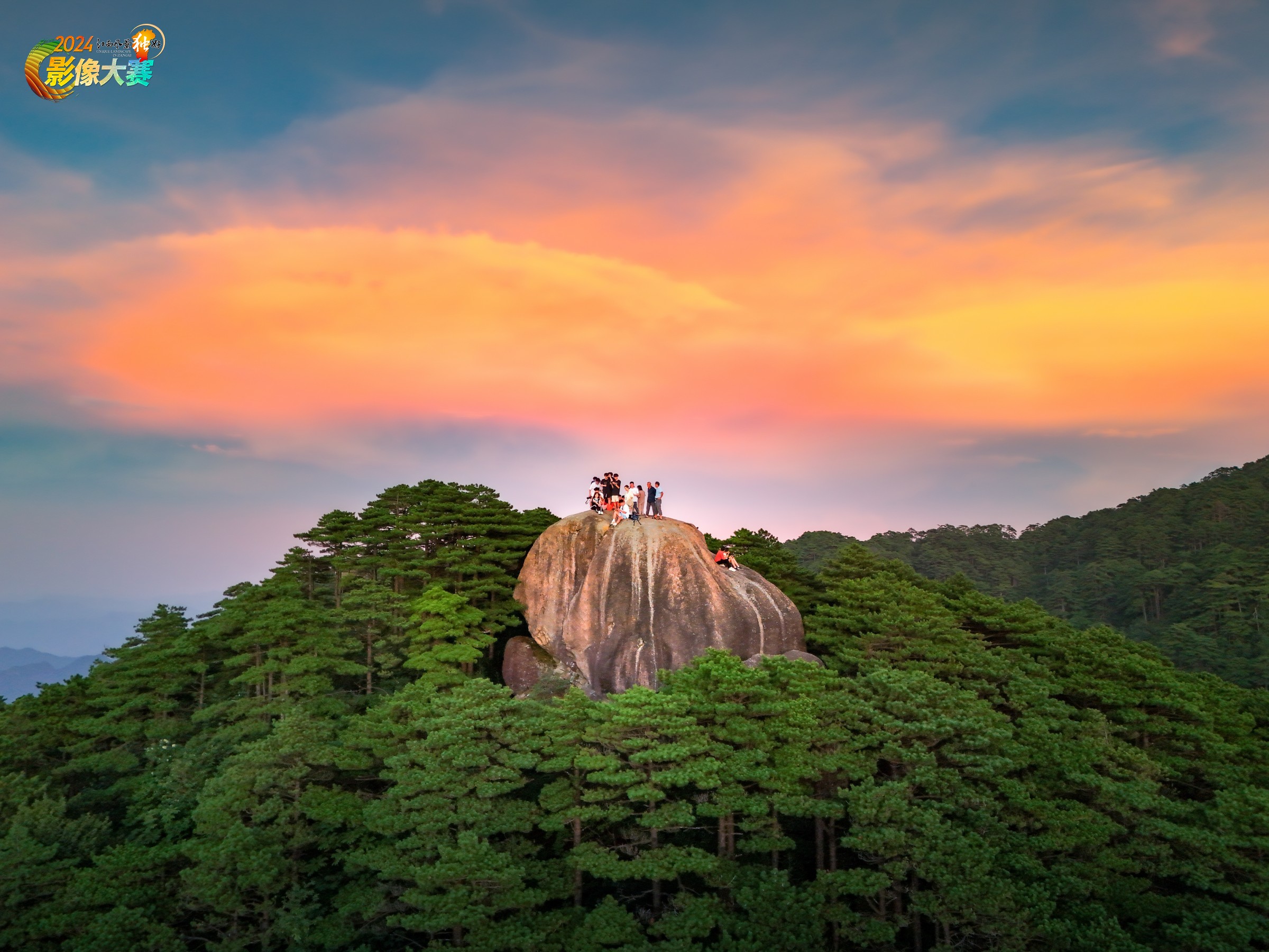 三清山紫烟台上,站着一群追逐夕阳的游客,脚下高耸的岩石是山林中被夕阳最后照耀的地方