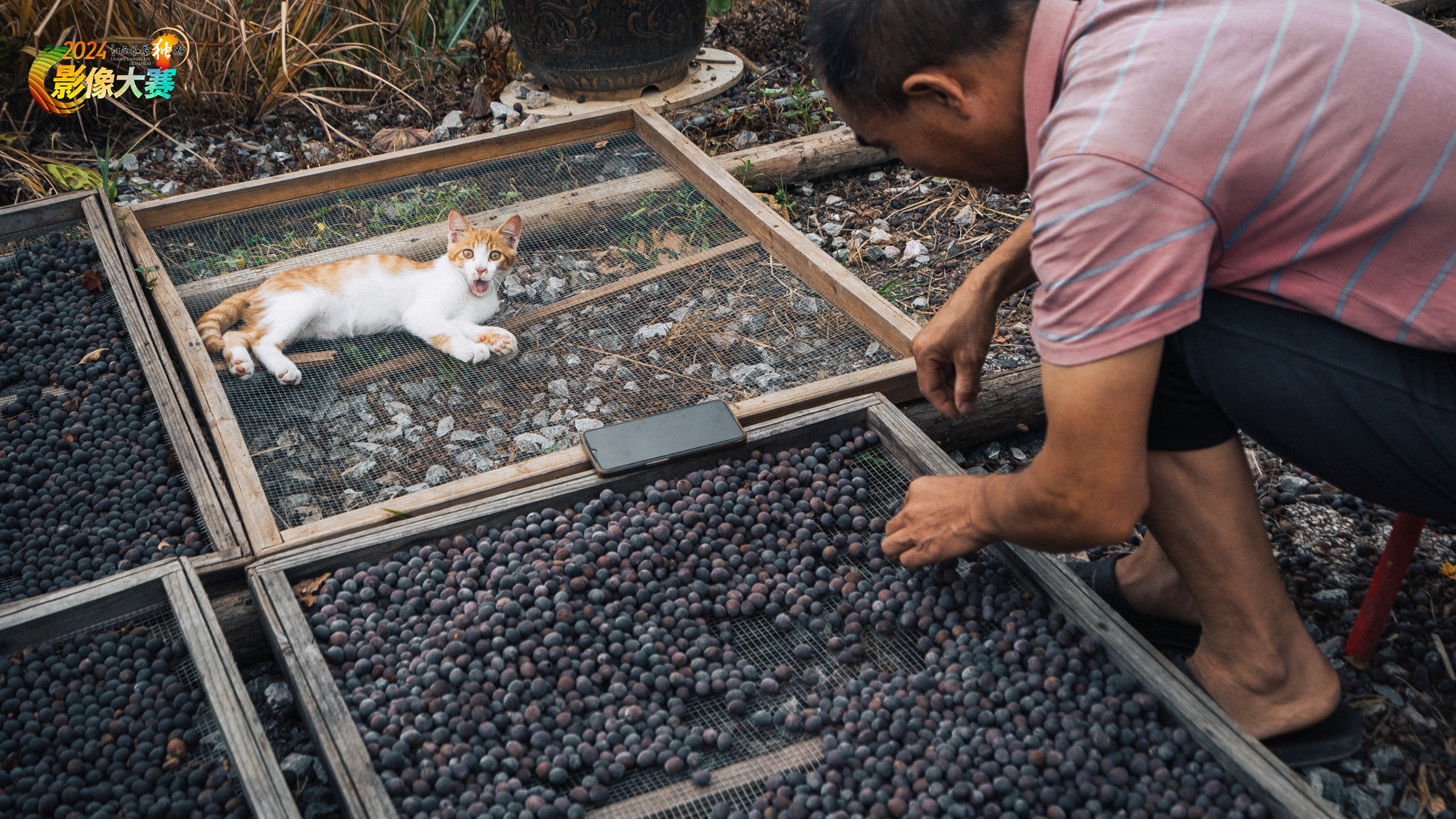 婺源县某莲花基地,挑拣莲子的师傅和他的小猫。