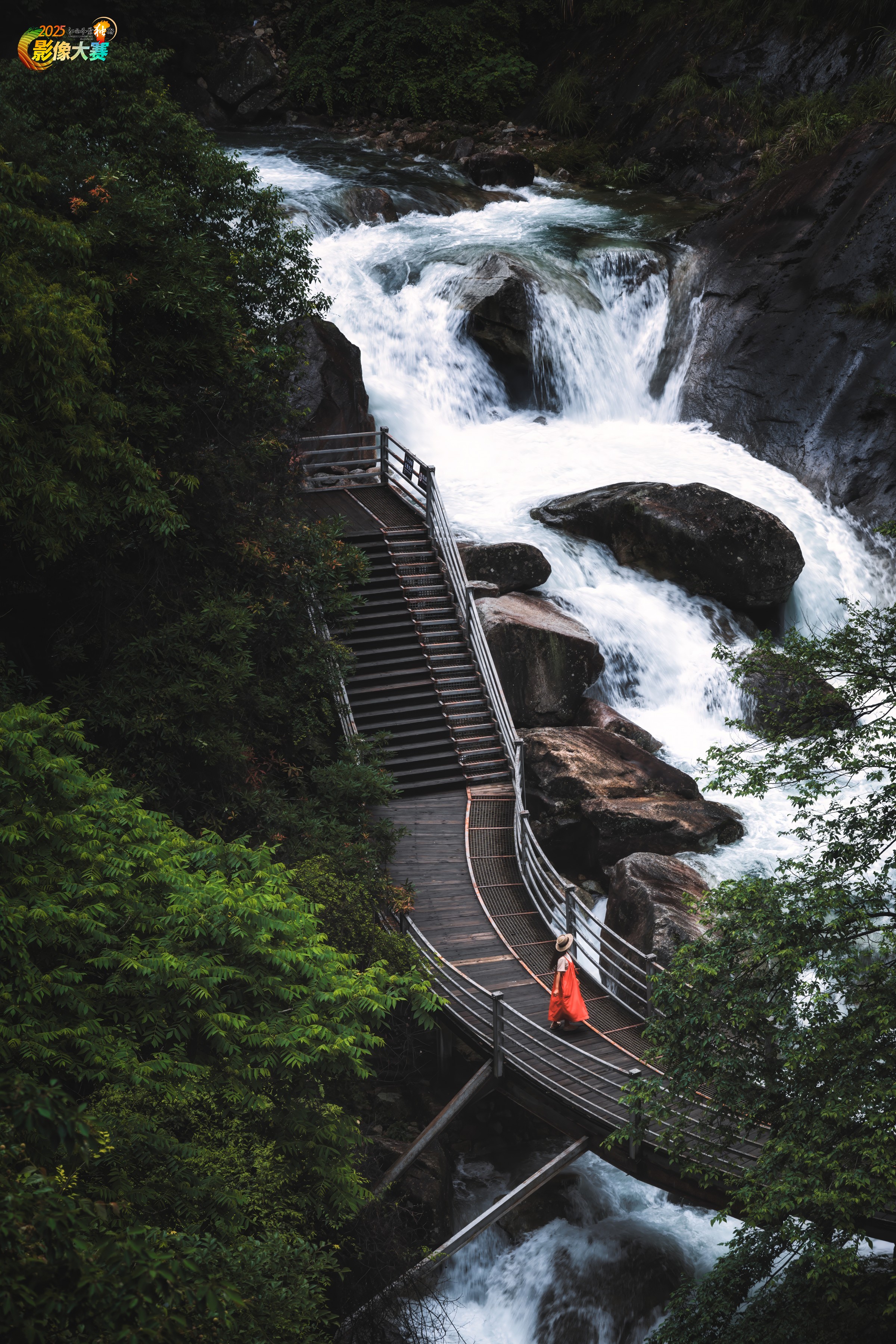 婺源县的卧龙谷,雨后大水,在步道上行走的游客融入大自然中。