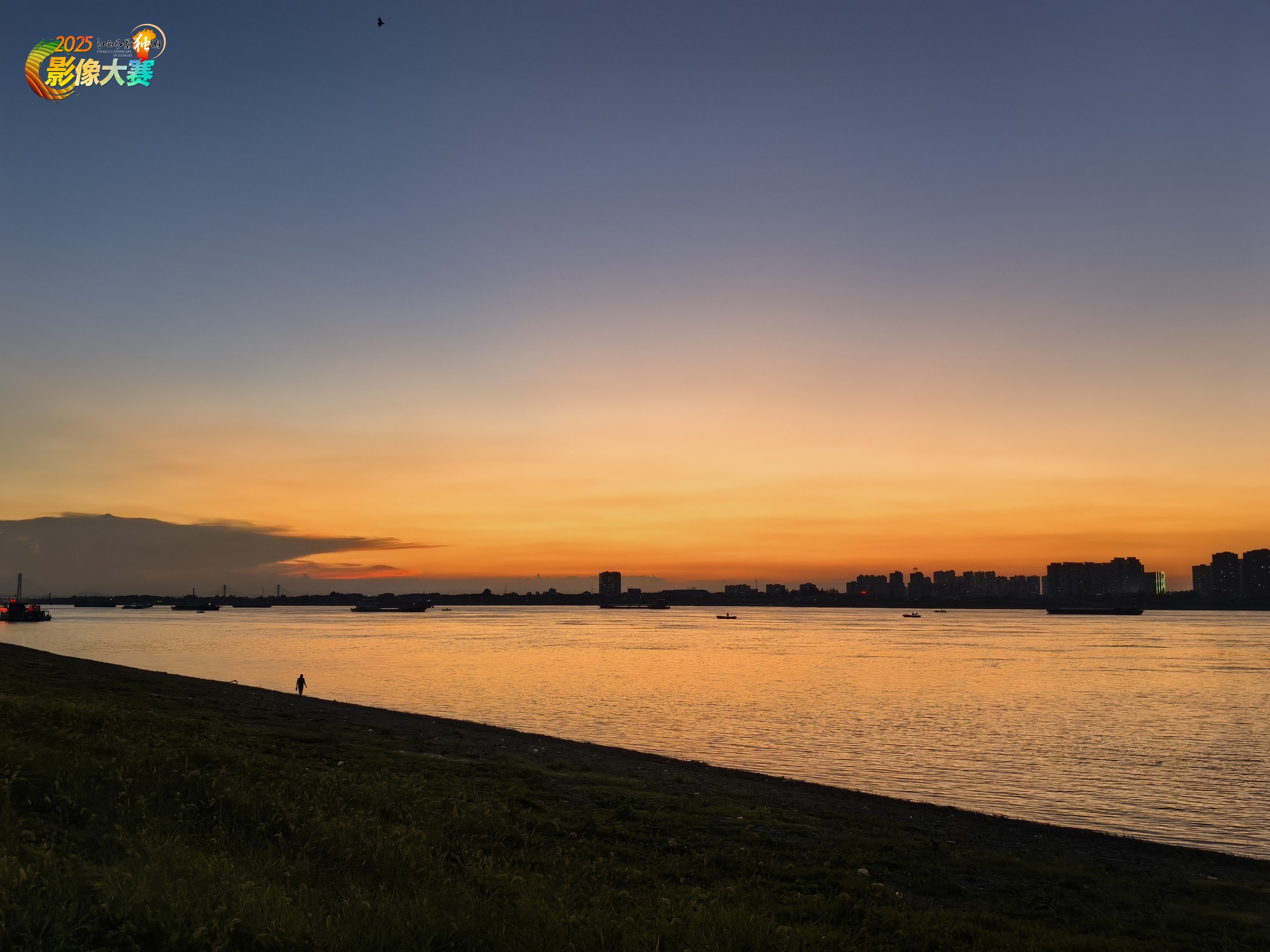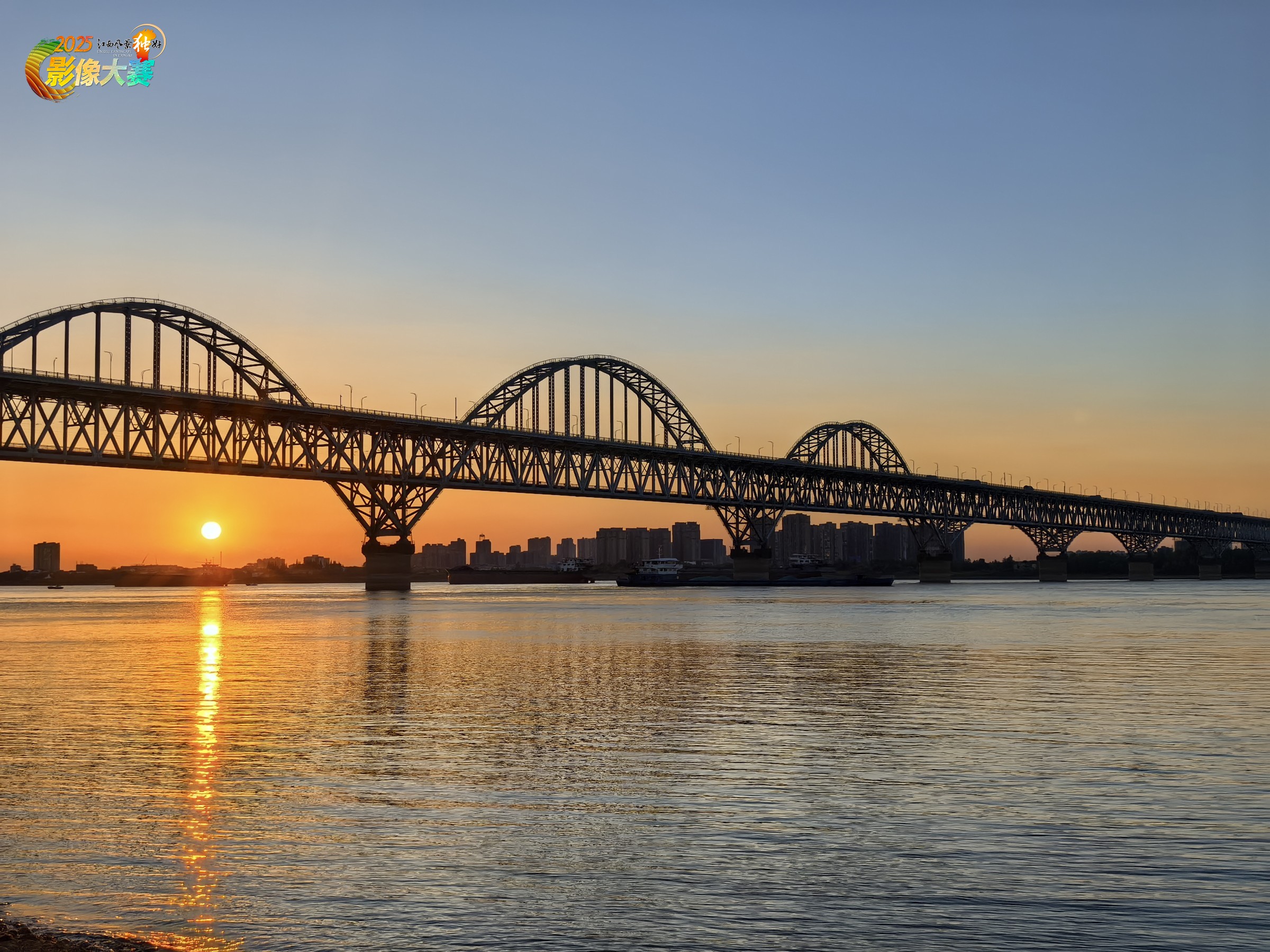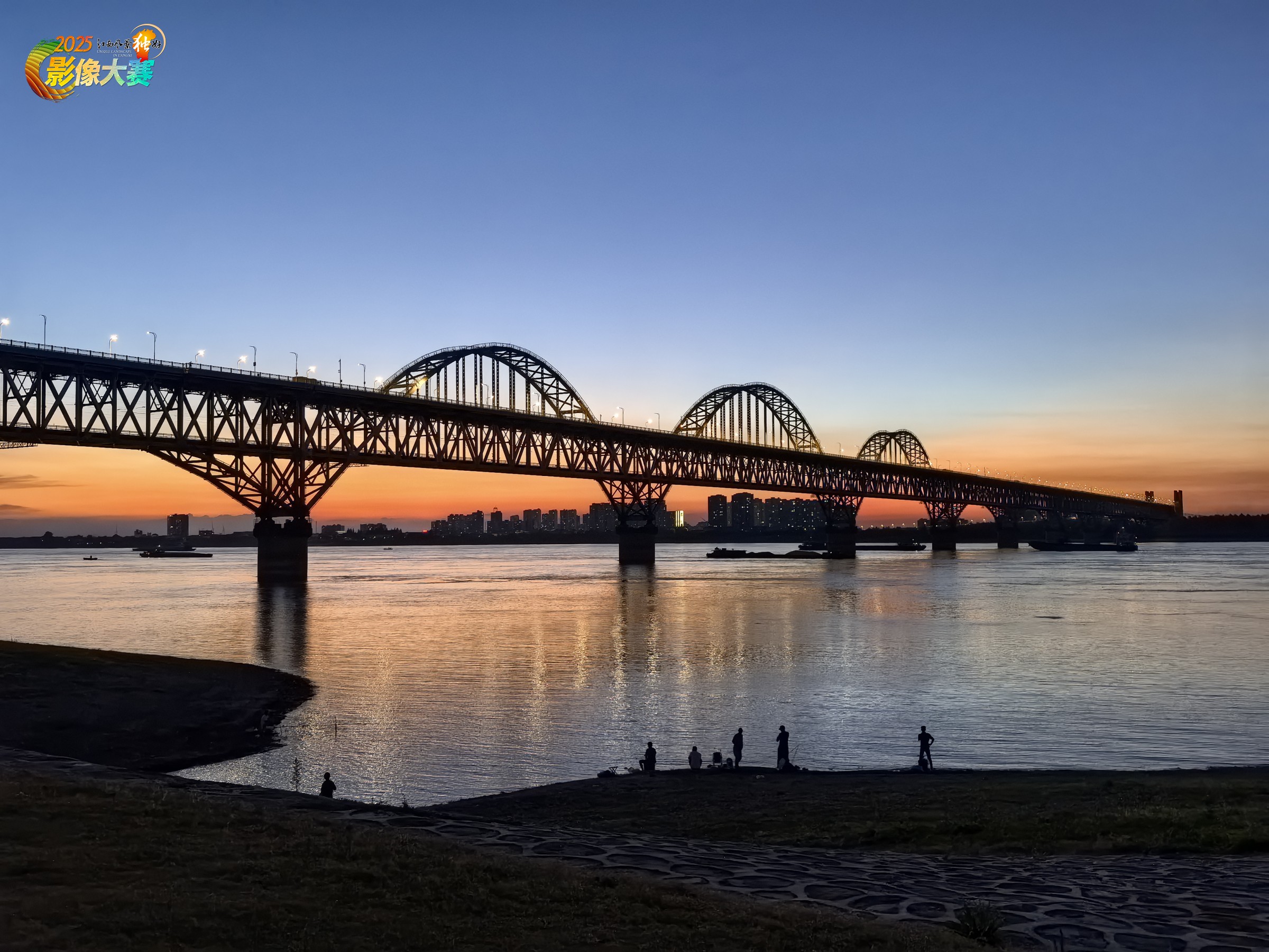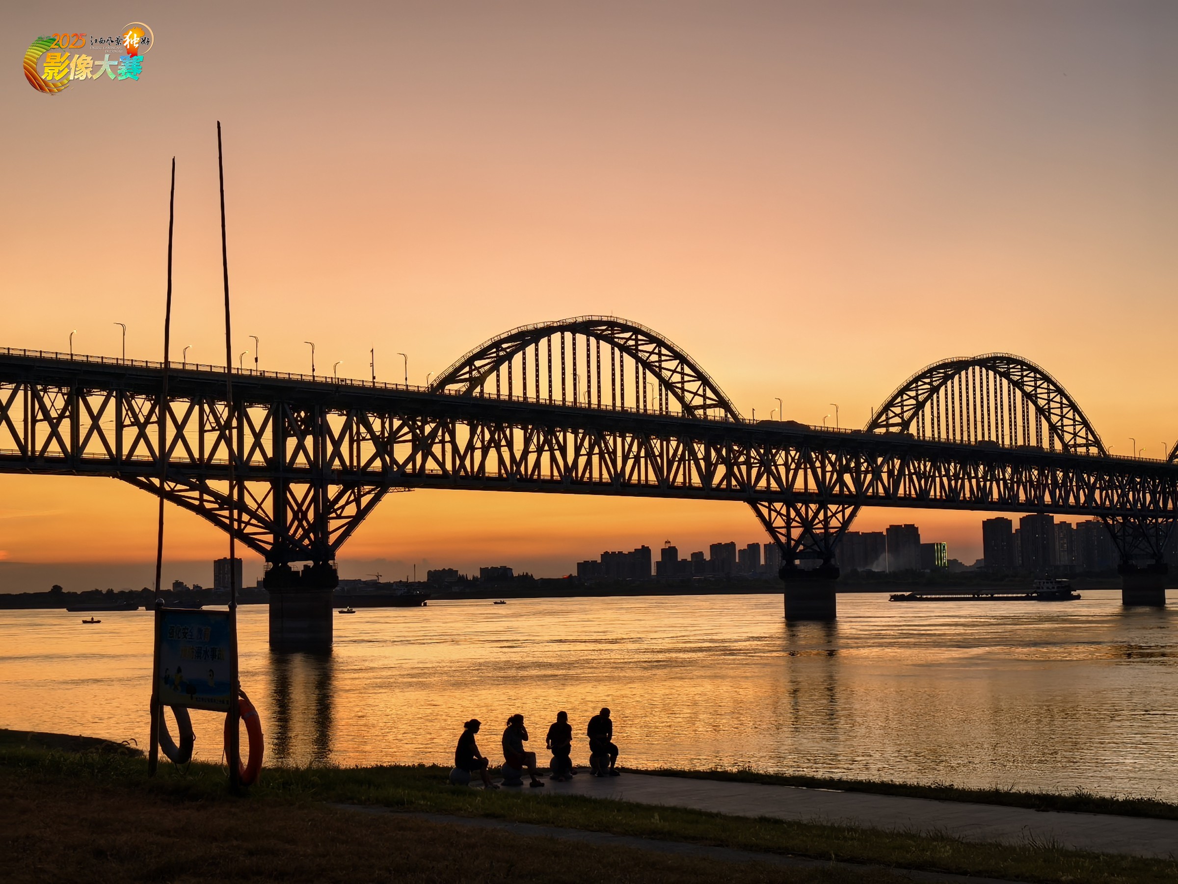 九江长江大桥的黄昏日落,江边弹着吉他唱歌的大叔,休闲散步的人们,让人感受无限美好的山水画卷。