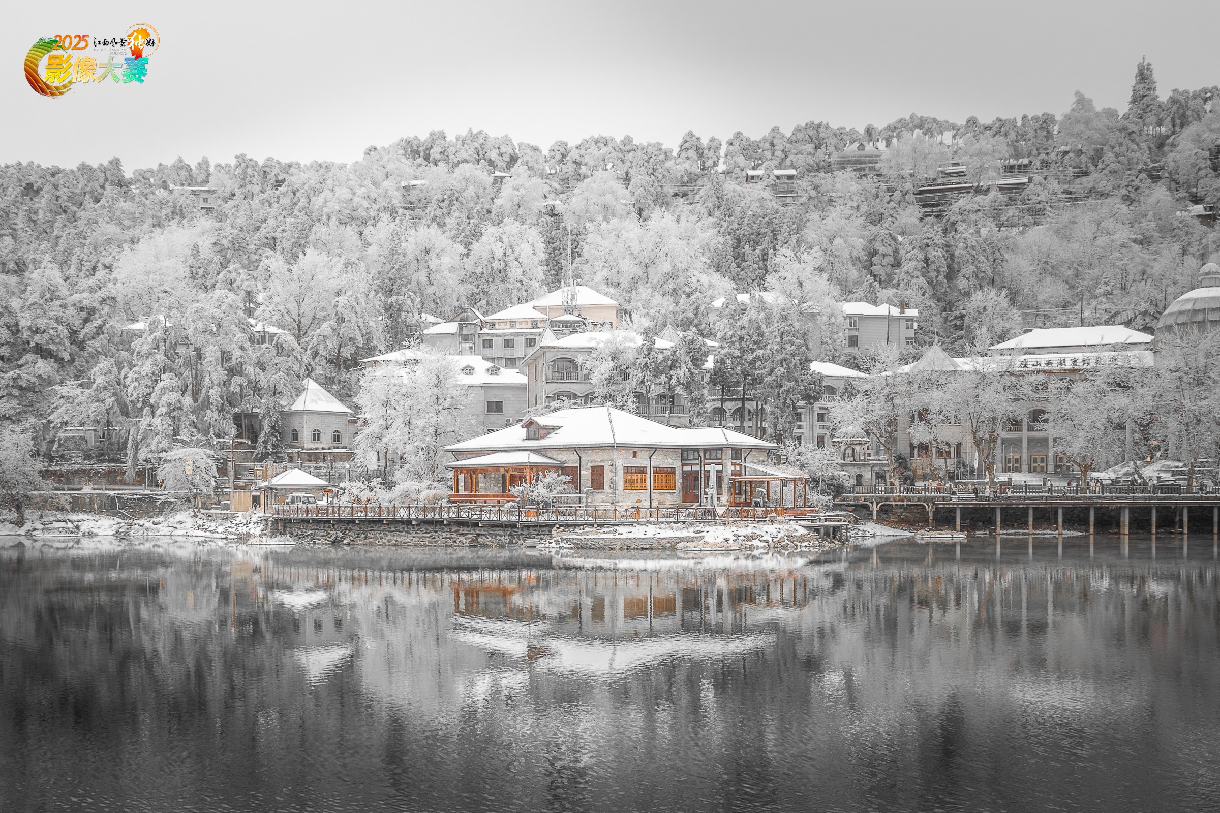 雪落庐山时,如琴湖便成了一幅素白的水墨长卷。镜头定格的刹那,天褪去了往日的澄澈,一片轻白;山也卸下青绿,裹着厚雪化作蜿蜒的银脊;湖畔的林木凝霜缀雪,枝桠间积着蓬松的白,连错落的屋舍也被雪覆了檐角,成了素色画卷里温润的点缀。最妙是湖面,没有冰封的冷硬,反倒映着天、云、山、屋的影子,将 “上下一白” 的意境拉得绵长 —— 天上是漫无边际的白,山间是层层叠叠的白,水中是虚实交织的白,仿佛整个世界都被这场雪滤去了杂色,只留一份清寂、纯粹的诗意,让人在驻足间,便坠入了庐山冬雪独有的静谧与苍茫里。