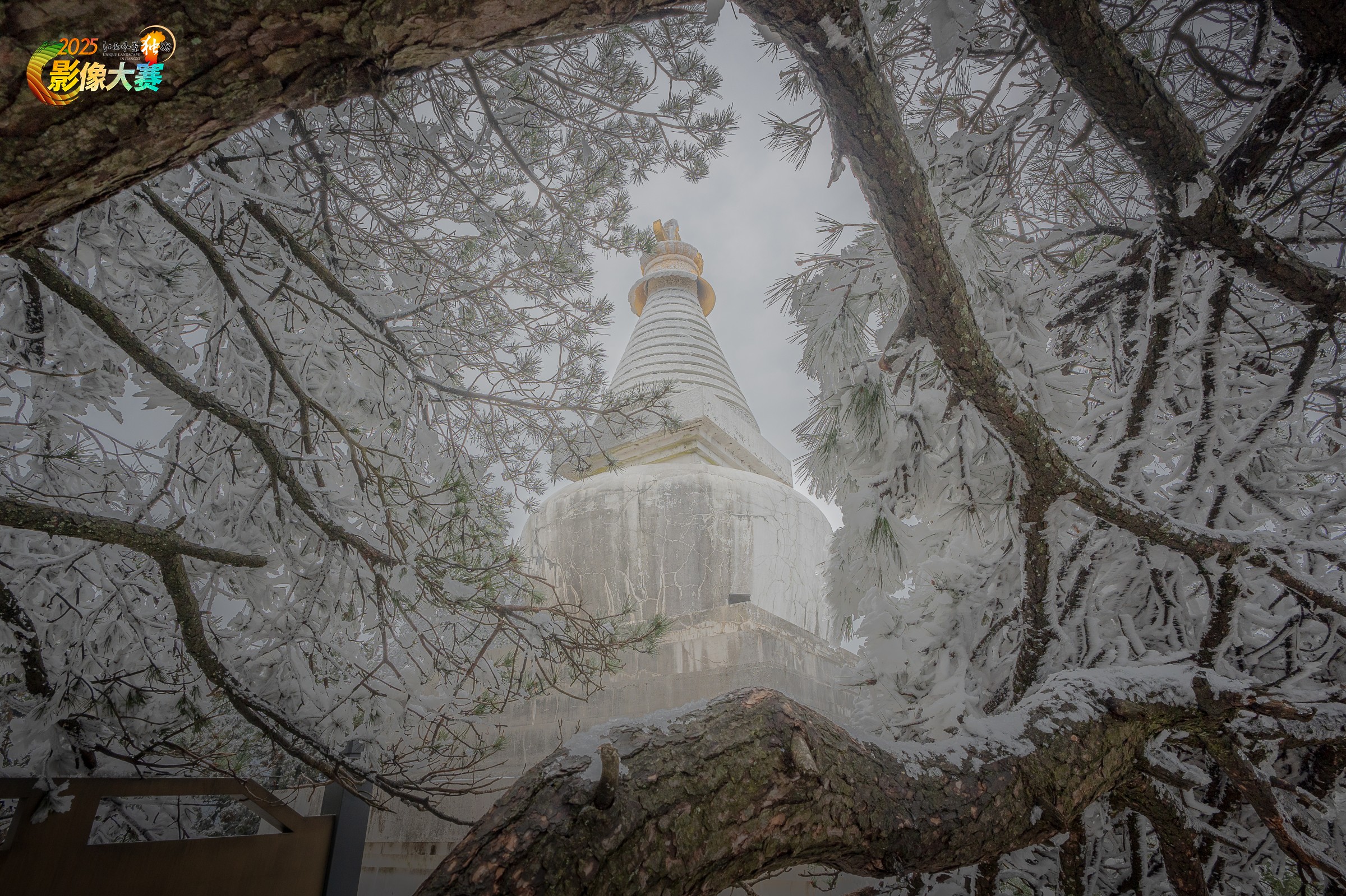 镜头聚焦庐山小天池的冬雪时,特意以挂满雾凇的树木为天然画框,树影交错间留出的空隙,恰好将远处的白塔框在其中:白塔通体素白,与树上的雾凇同色,仿佛从冰雪里生长而出,塔身的纹路被雪衬得愈发柔和,塔尖在微光中泛着淡淡的光泽。没有多余的色彩干扰,树的白、雾凇的白、白塔的白融为一体,连空气都似被滤成了纯净的白,既藏着构图的巧思,又透着冬雪独有的静谧与温润,让人一眼便沉醉在这份 “万物皆白” 的诗意里。