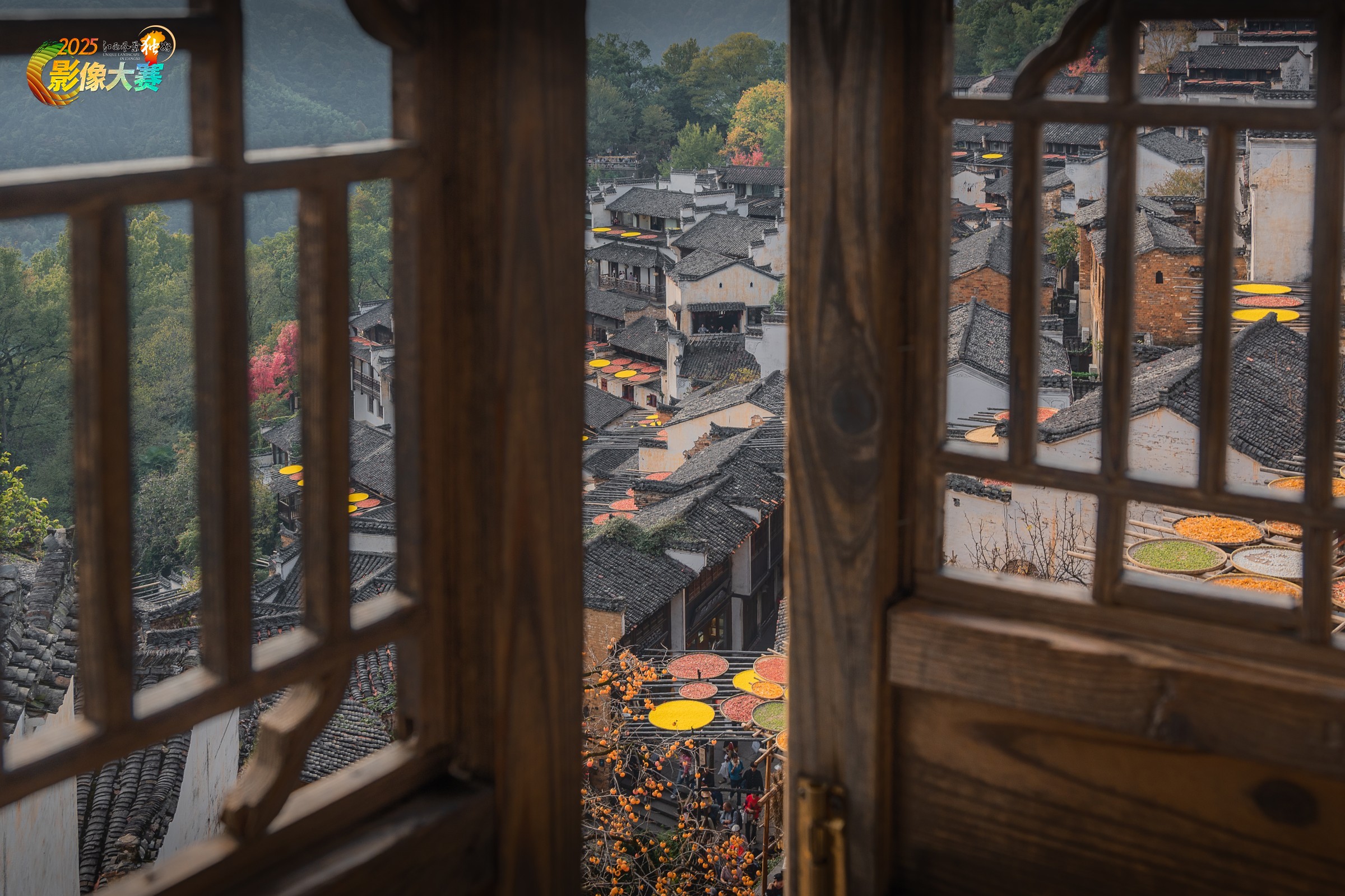 在婺源篁岭的一间老屋中,将镜头对准半开的木窗 —— 窗框成了天然的画框,木质的纹理带着岁月的温润,半掩的窗扇似是特意留出的缝隙,将窗外的晒秋景致温柔地 “框” 了进来,却又不将画面完全闭合,恰好生出 “呼之欲出” 的灵动。透过窗棂望去,晒秋的热闹扑面而来:黛色瓦檐上,晒匾层层叠叠,金黄的玉米、火红的辣椒、橙黄的南瓜干,在天光下透着鲜活的色彩;远处的白墙黛瓦顺着山势铺展,炊烟袅袅间,藏着山村的烟火气息。窗框的线条将这份热闹稍稍 “收束”,室内的静谧与窗外的鲜活形成巧妙对比,仿佛只需推开那半扇窗,就能伸手触碰篁岭秋日里最浓郁的生机,让观者不自觉地沉浸在这份 “窗内是岁月,窗外是秋光” 的诗意里。