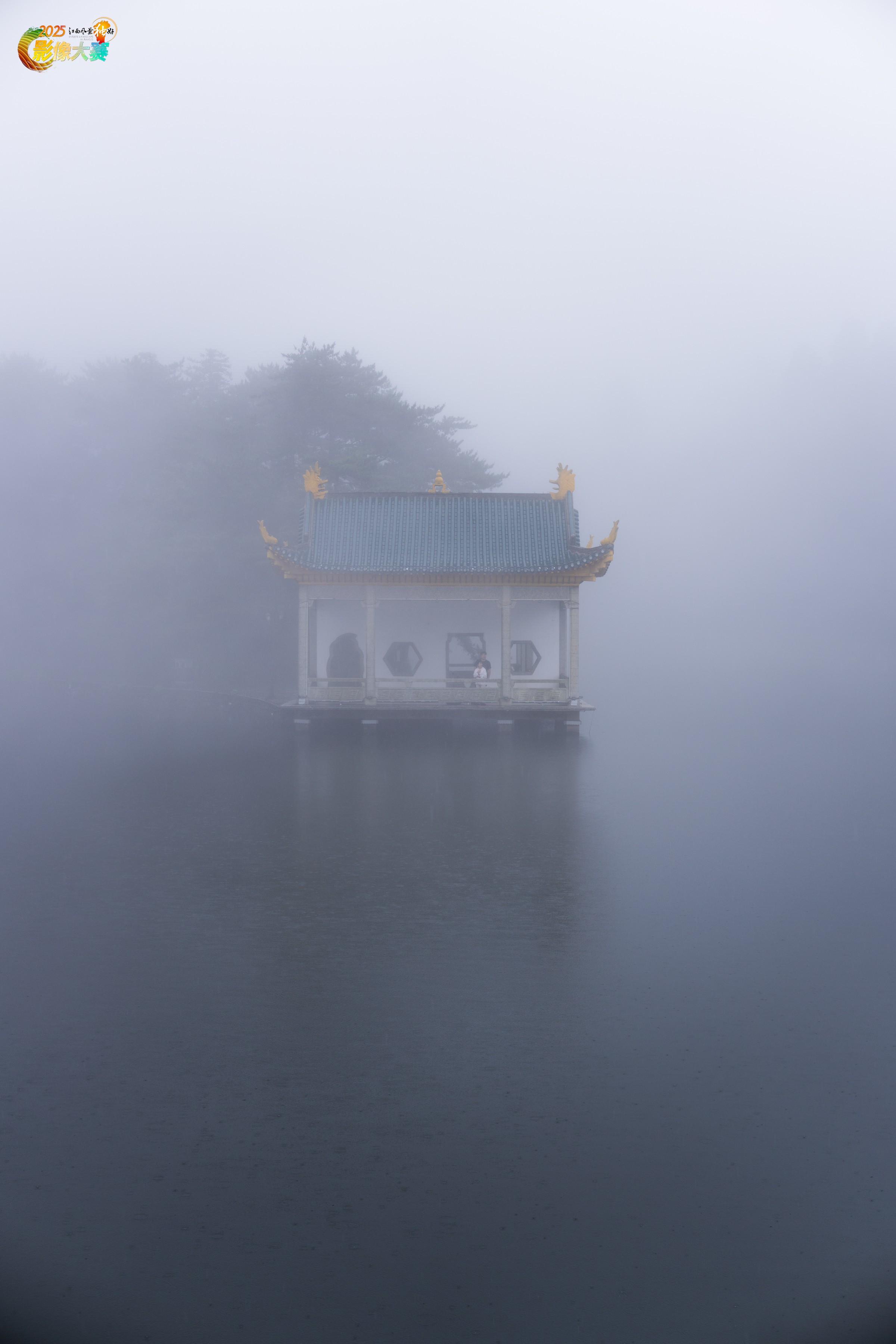图片《云雾匡庐》拍摄于江西庐山如琴湖旁,展示2025年庐山6月的山水云雾之景。雾气之中,湖中之庭径缓缓浮现,显示出遥远而典雅的东方山水意趣。小庭之中有一对游客欣然赏景,给凝滞的画面增添别样的生机和动感。云雾在此处悠扬地飘荡浸润了千年,千百年来人的脚步让它获得了穿越时空的意义,而它也赋与观景之人审美的感召与体验。