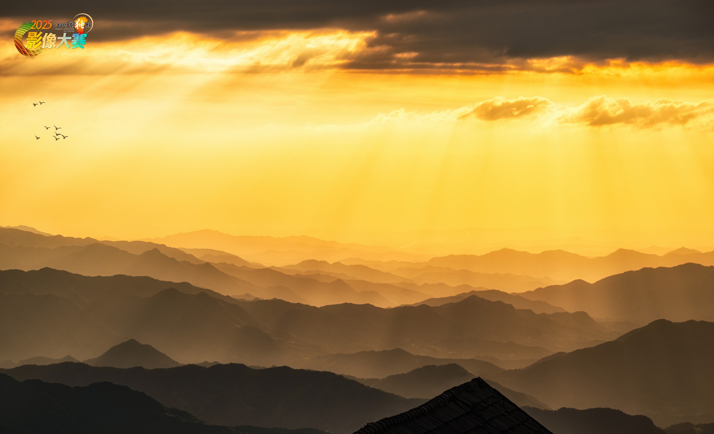 萍乡武功山的日落时分,天空绽放万道光芒,胜似千里江山图