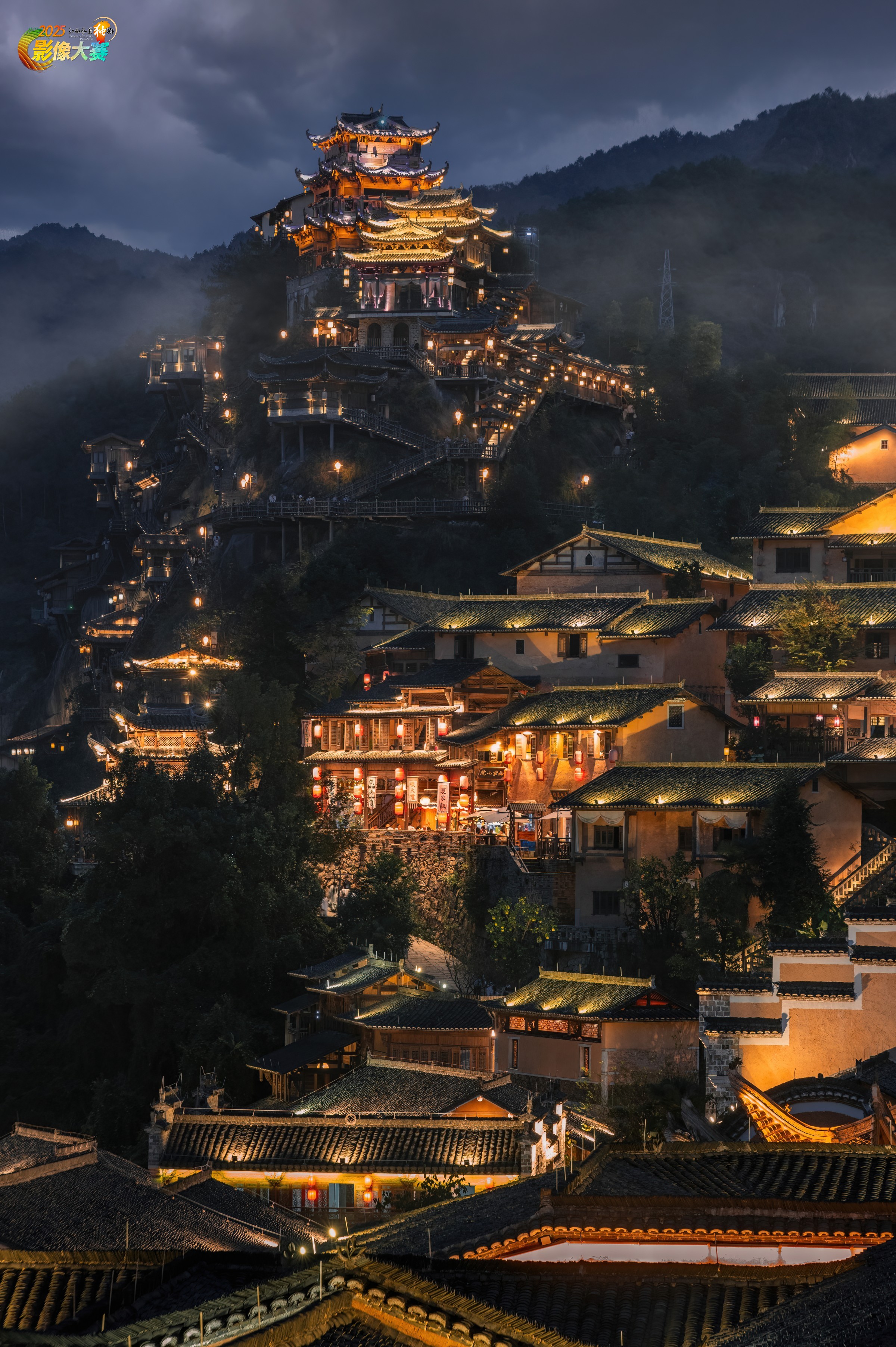 摄于上饶望仙谷,夜幕时分,华灯初上,云雾缭绕于山峦之间,与鳞次栉比的古建筑交相辉映,彷佛置身仙侠世界。