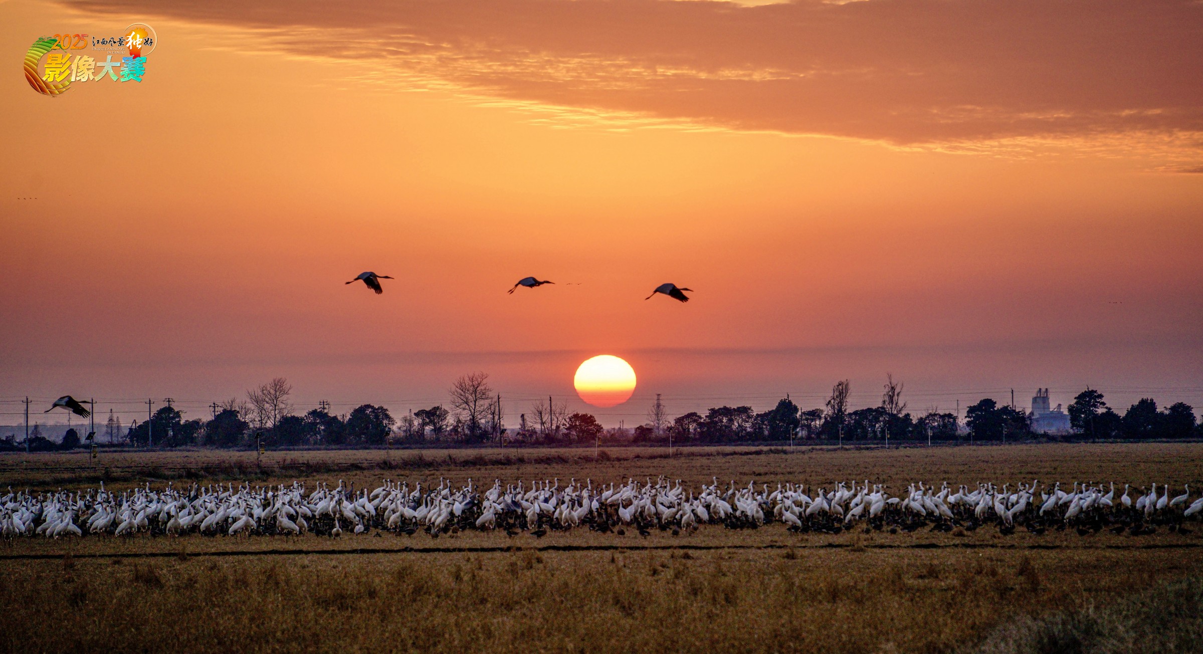 暮云合璧,倦鸟归巢。傍晚时分,夕阳缓缓西沉,将云天、飞鸟染成一片绚烂的橘红与金黄,见证着鄱阳湖日复一日的晨昏交替。