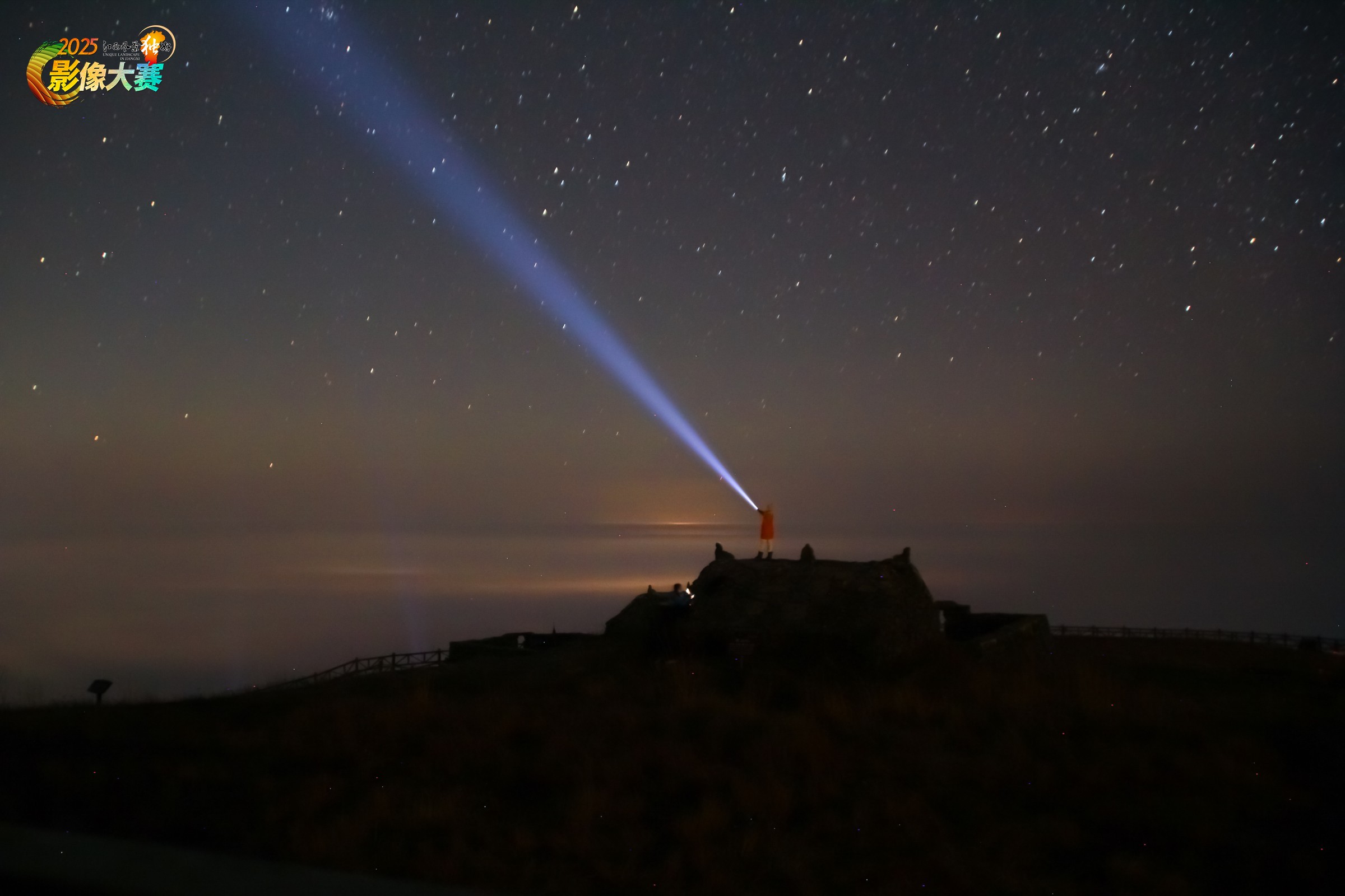 夜色中的武功山金顶,草甸与石屋浸在墨色里,唯有一束手电光如银蓝画笔,径直划破苍穹,向着漫天繁星的深邃宇宙延展。点点星光在天幕铺就银河,远处地平线泛着朦胧的暖光,人与天地在此刻对话——是人间灯火对星河的呼应,也是渺小生命向浩瀚宇宙的叩问,尽显武功山之夜的苍茫与浪漫。
