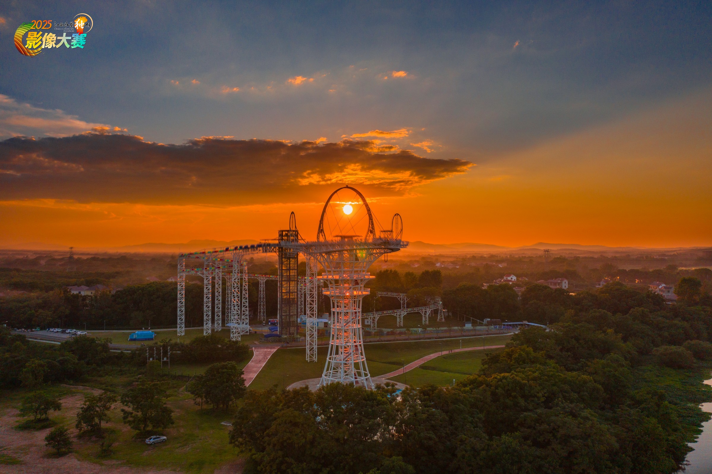 航拍镜头下,江西省吉安市泰和县蜀口洲的“爱塔”高空漂流综合体如一座“大地之眸”,在落日熔金般的霞光中静静伫立。夕阳恰好悬于观景台中央的圆环之上,金属架构的冷冽线条与橙黄天际的暖柔色调碰撞交融,脚下是赣江冲积平原的墨绿剪影,远处山峦在暮色中如淡墨晕染——这座“千里赣江第一岛”的网红打卡地,将工业风与自然诗意编织成帧,尽显黄昏时分的雄浑与精巧。