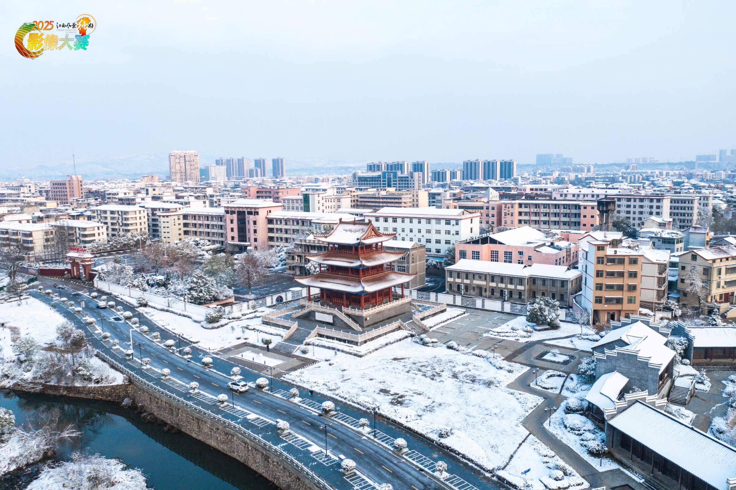 航拍视角下,江西泰和县的千年名阁快阁静立雪中,三层飞檐覆着薄雪,红漆木构在灰白天地间愈显古雅。