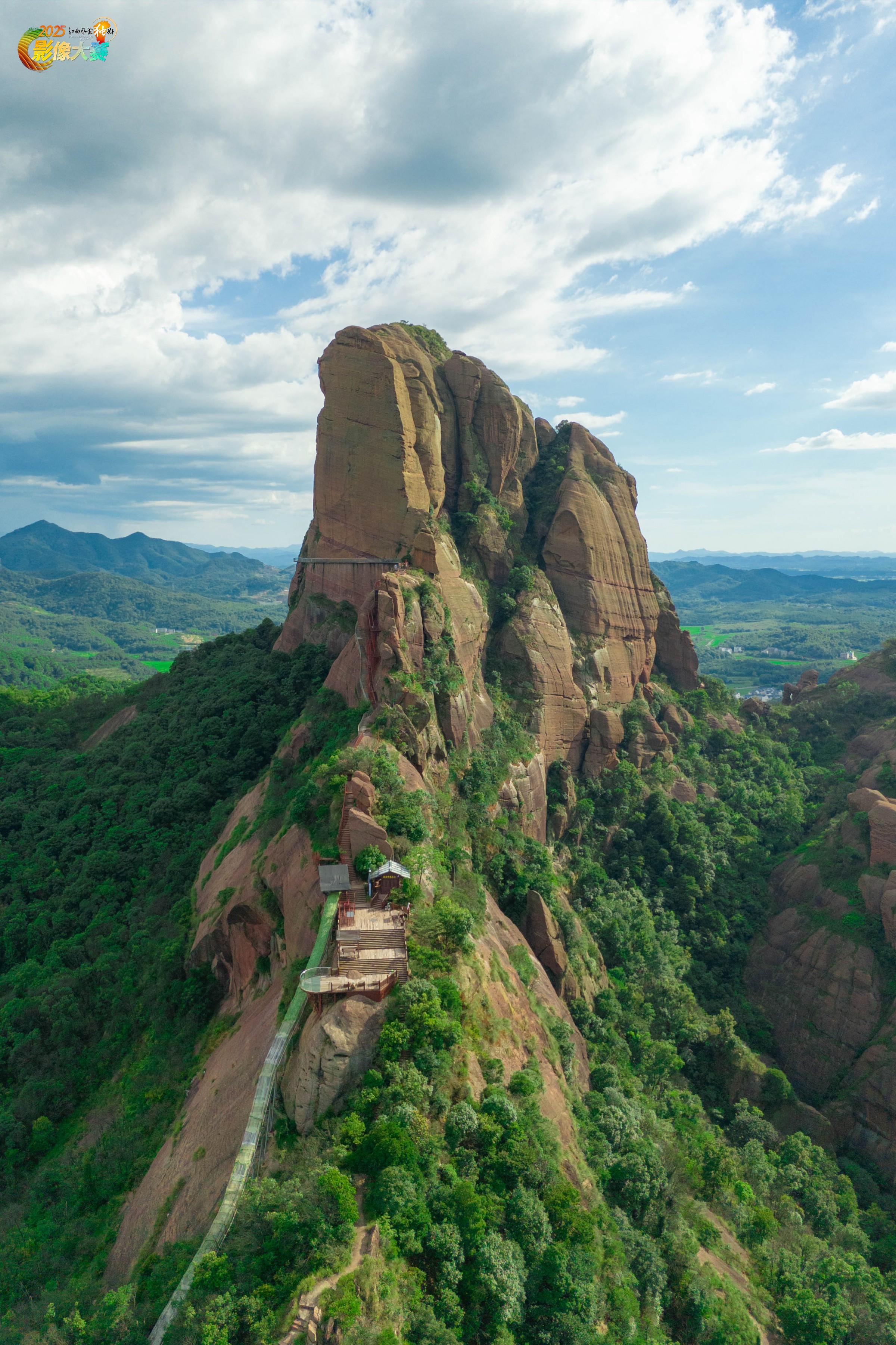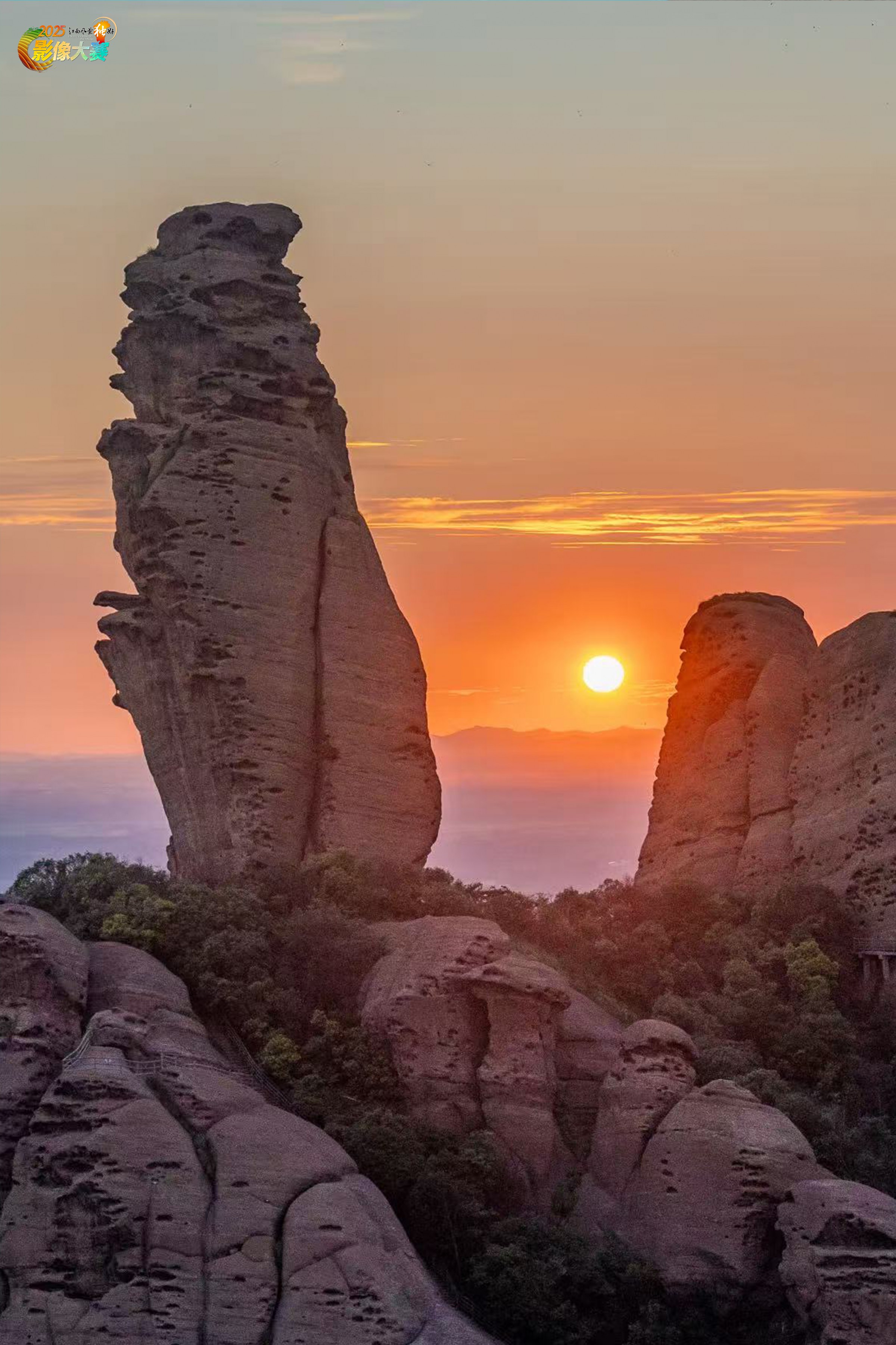 阳光倾泻,龟峰的丹霞群峰披上金红色的外衣。赭红的岩壁、翠绿的植被与湛蓝的天空形成强烈的色彩碰撞,光影在山峦的褶皱间跳跃,勾勒出大地最雄浑而温暖的质感。