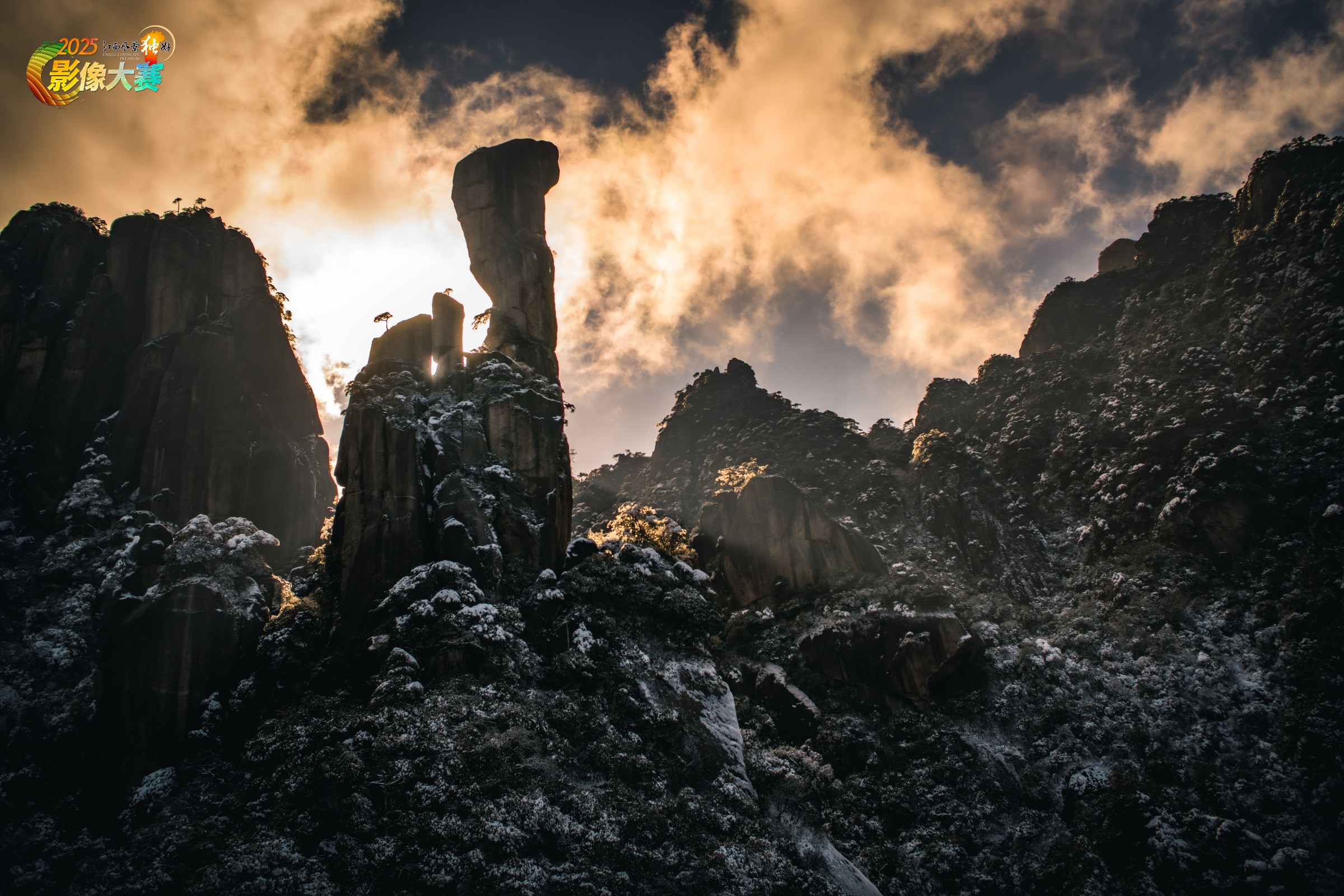 这张照片呈现的是三清山的巨蟒峰。冬日里,巨蟒峰周边被白雪覆盖,增添了几分清冷与纯净。后方的太阳洒下金黄的光辉,为巨蟒峰及周围的山峦、云雾镀上一层暖色调,冷暖色调相互交融,既展现出冬日雪景的静谧素雅,又因阳光的照耀而有了灵动的暖意,凸显出巨蟒峰独特的造型与冬日三清山壮丽又奇幻的景致。