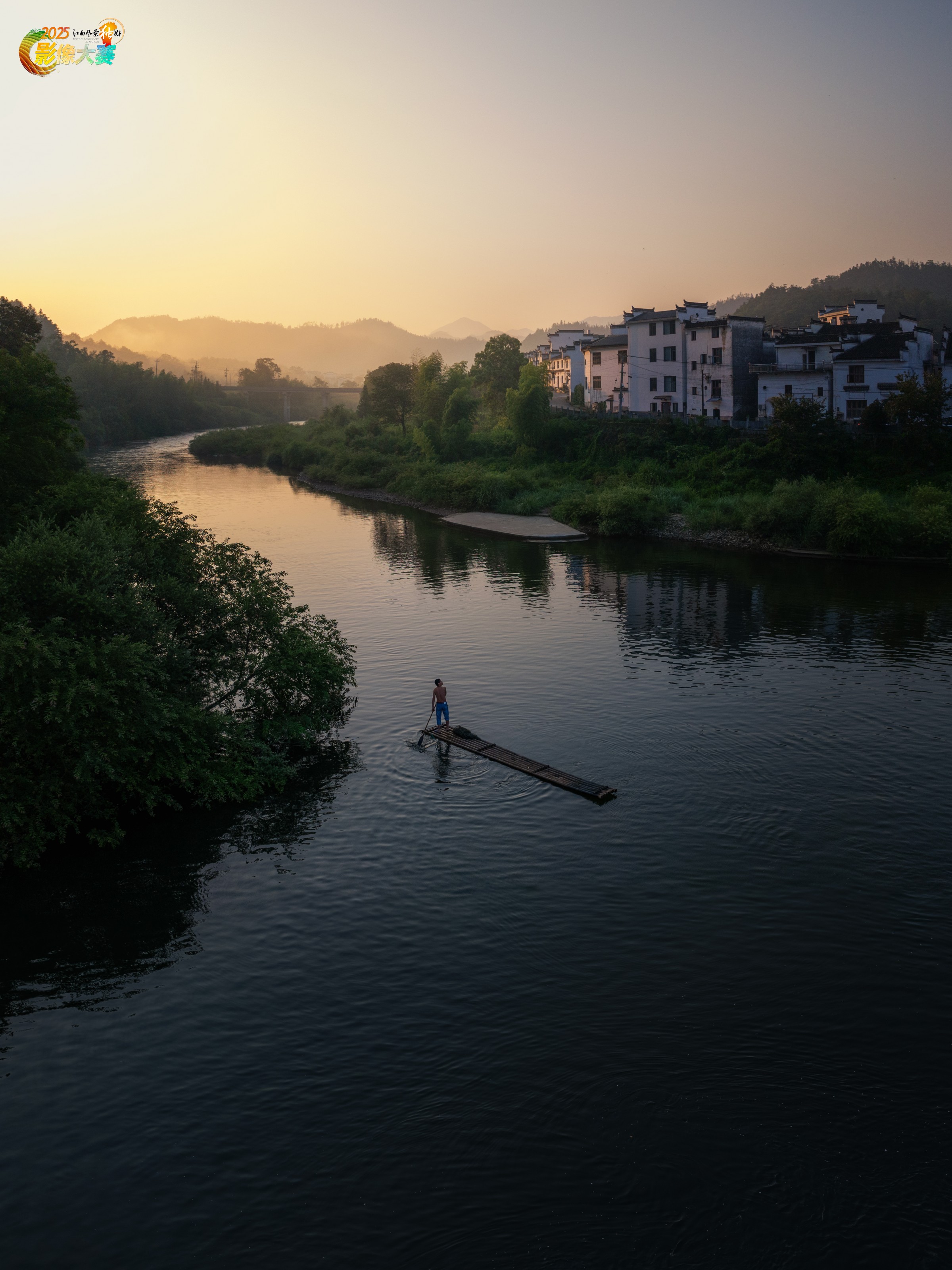拍摄于婺源的一个村庄,展现了江西婺源宁静而美好的乡村景致。画面中,一条清澈的河流蜿蜒而过,晨光柔和地洒在水面上,泛起微微的涟漪 ,给人一种静谧而温暖的感觉。 河中央,一位村民悠然地站在竹筏上,竹筏轻摇,在水面划出一道道波纹,仿佛是在弹奏一曲悠扬的晨歌。村民的身影在晨光中显得格外闲适,传递出一种远离喧嚣、悠然自得的生活态度。 河流一侧,葱郁的植被繁茂生长,绿意盎然,为画面增添了勃勃生机。而另一侧,错落有致地分布着白墙黛瓦的徽派建筑,这是婺源极具代表性的建筑风格,粉墙在晨光的晕染下泛着淡淡的暖色调,黛瓦则显得古朴而厚重 。 远处,山峦在薄雾与晨光的笼罩下若隐若现,整个场景宛如一幅淡雅的水墨画,充满了诗意与韵味,淋漓尽致地展现出婺源乡村独有的自然之美与人文风情,让人不禁沉醉于这如诗如画的田园风光之中。