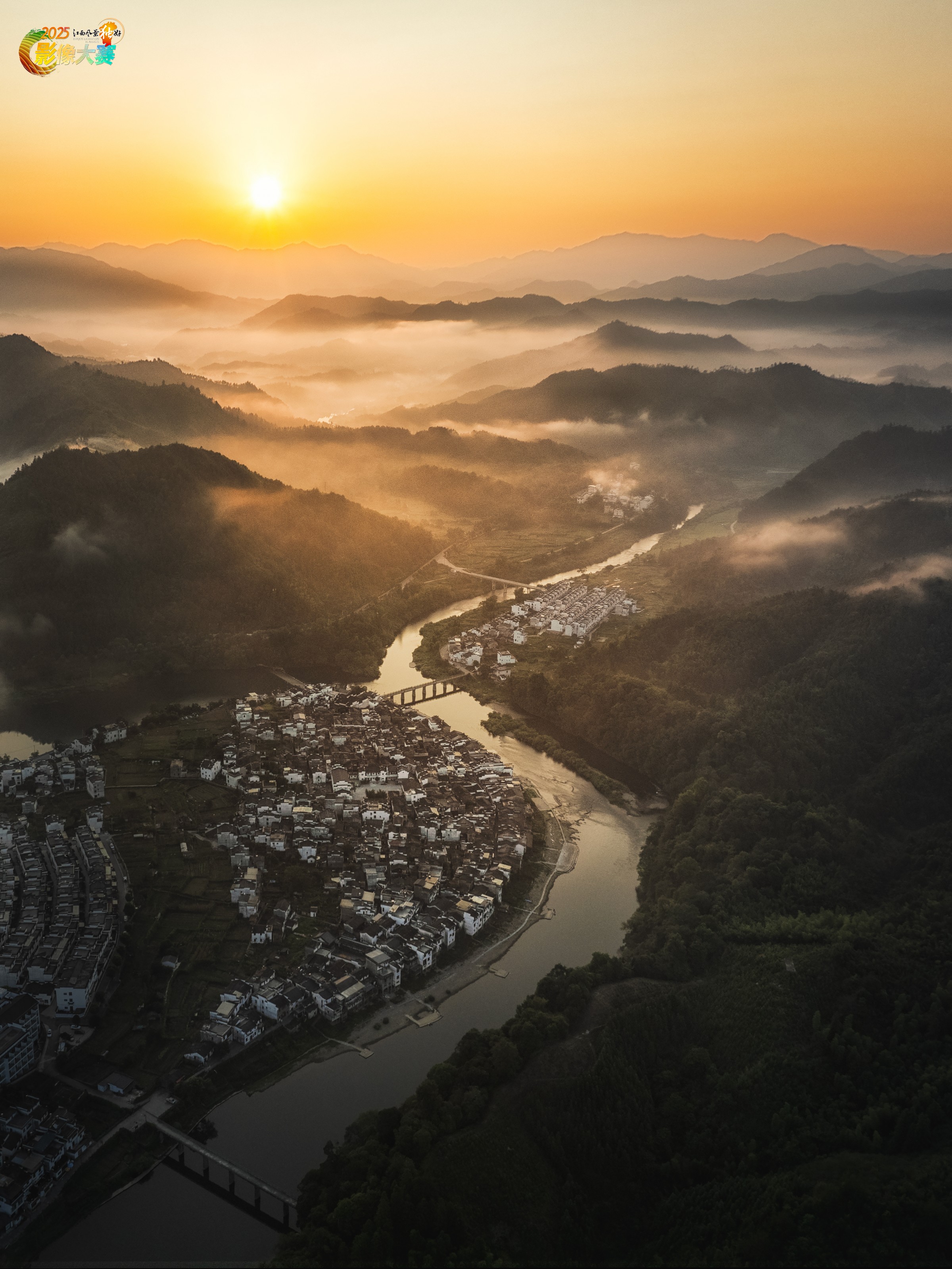 拍摄于婺源的一个村庄。画面中,初升的太阳散发出柔和而温暖的光芒,给整个场景镀上了一层金色的光辉。远处连绵起伏的山峦在晨雾的缭绕下若隐若现,仿佛是一幅徐徐展开的水墨长卷,朦胧中透着神秘的美感。 蜿蜒的河流宛如一条灵动的丝带,穿梭于青山与村落之间,为画面增添了一份灵秀之气。河上的桥梁不仅是交通要道,更成为了这幅山水画卷中的点睛之笔,连接起两岸的风景 。 坐落于山水环抱之中的村落,白墙黛瓦错落有致,典型的徽派建筑风格尽显古朴与典雅。晨光洒落在屋顶上,与周围的自然景色相互映衬,勾勒出宁静祥和的乡村生活画面。整个场景宛如陶渊明笔下的世外桃源,远离尘世的喧嚣,充满了诗意与宁静,展现出婺源独特的田园之美和深厚的人文底蕴,让人不禁心生向往。