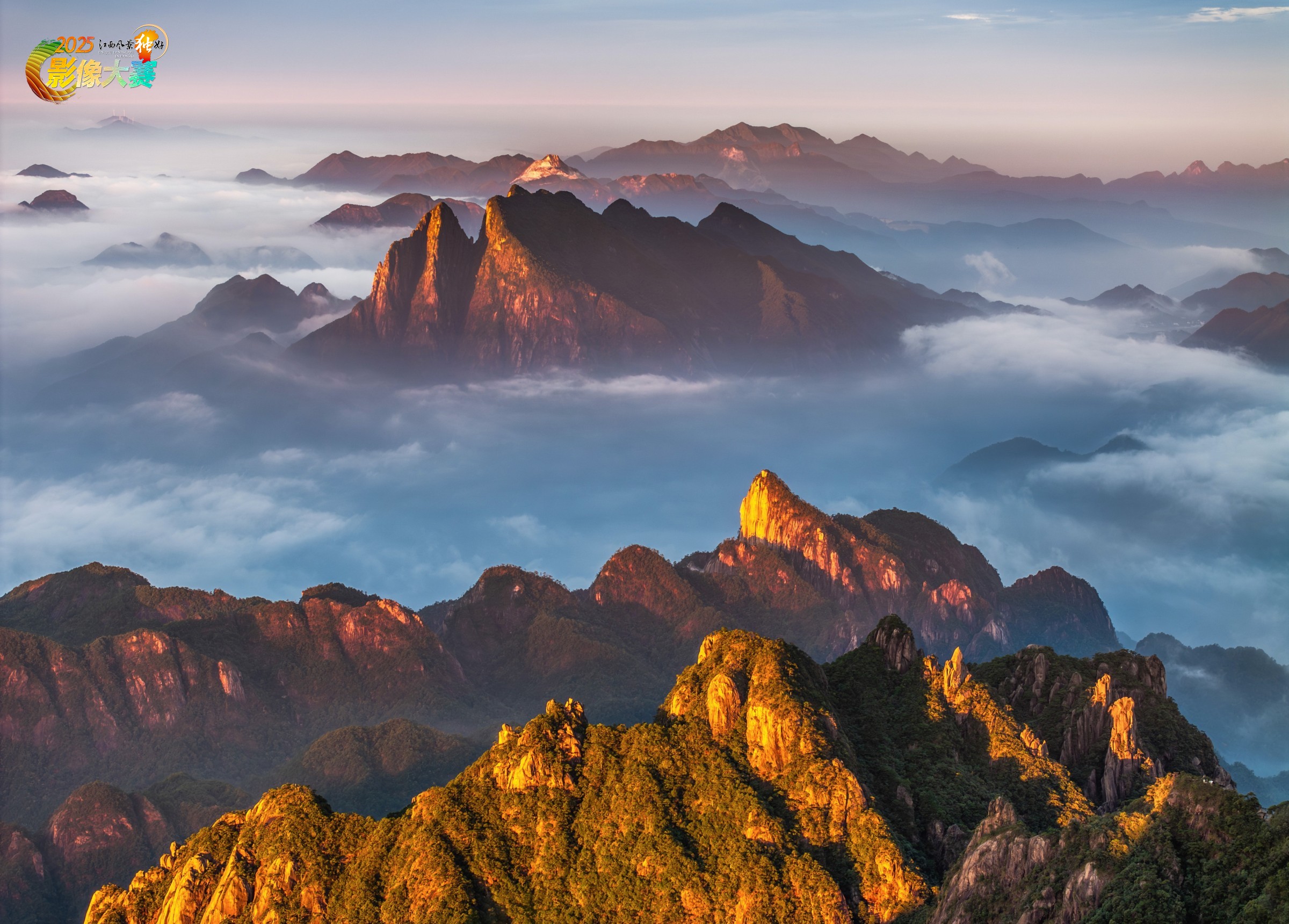 霞光为奇峰镀上绚烂色彩,云海在山峦间翻涌藏匿,勾勒出一幅山与云、光与影交织的绝美画卷。