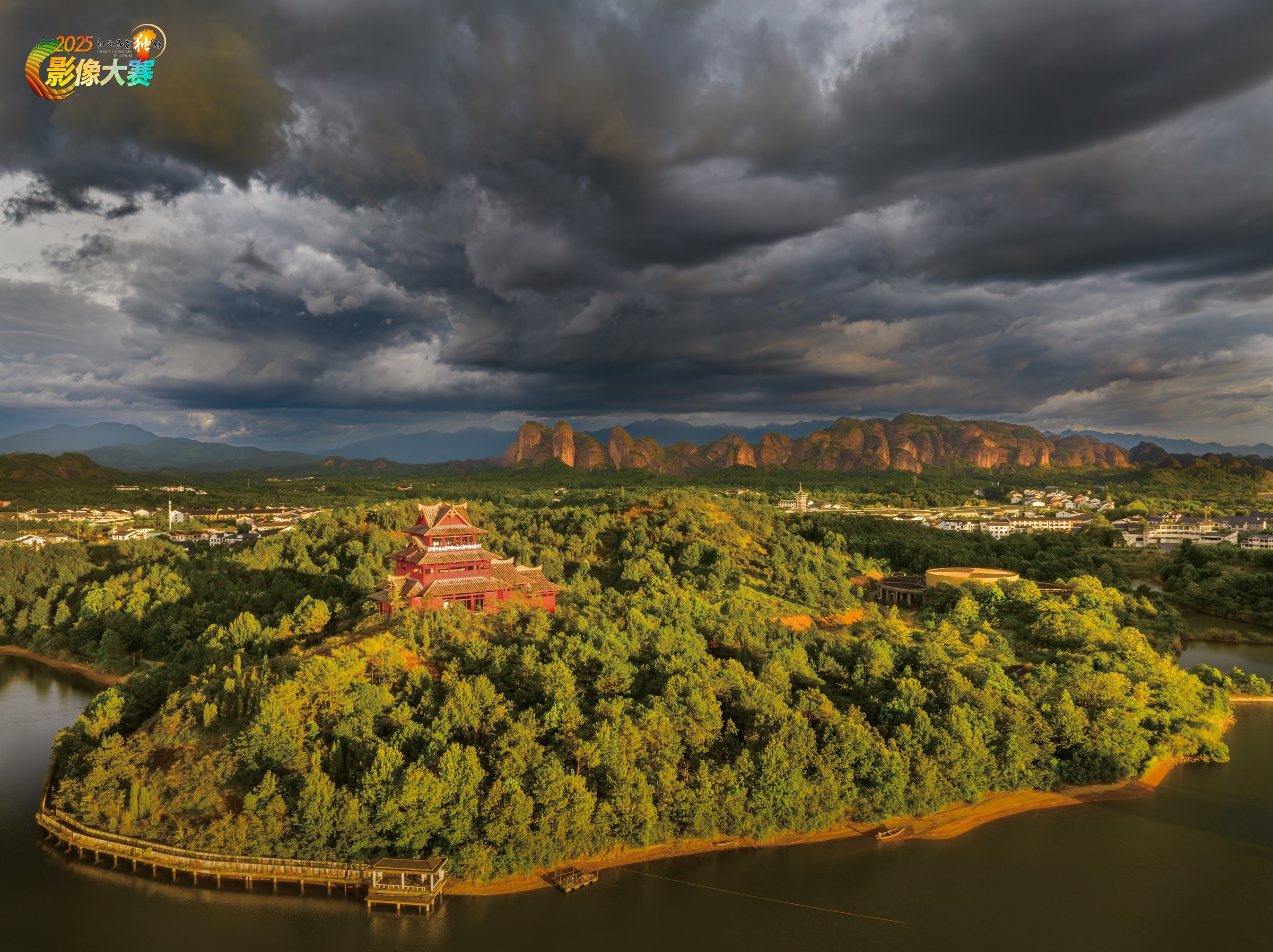 2024年7月25日,拍摄于江西省鹰潭龙虎山景区,此时是台风来临前的8小时,天上乌云如墨压顶,落日前太阳又光芒四射普照大地,天上的冷色与地上的暖色形成强烈的冷暖对比,这种壮观的景色实属少见。