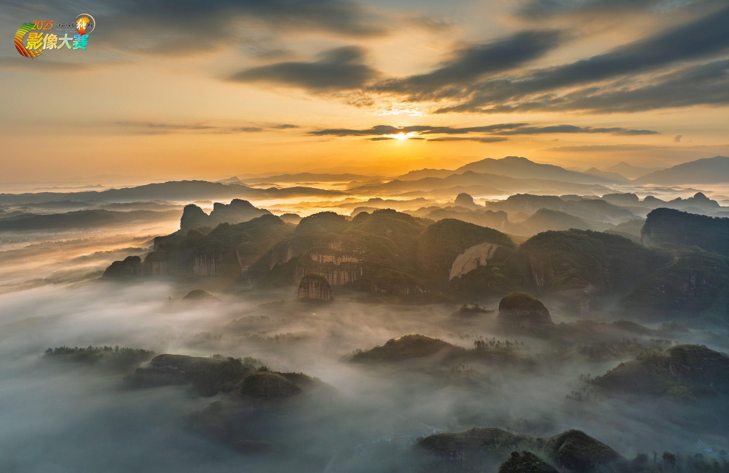 2025年2月28日,拍摄于江西省鹰潭龙虎山景区,霞光普照山体,云雾环绕群山,雾气“如轻纱覆城”的朦胧美感,展现出大自然与人生的感悟。