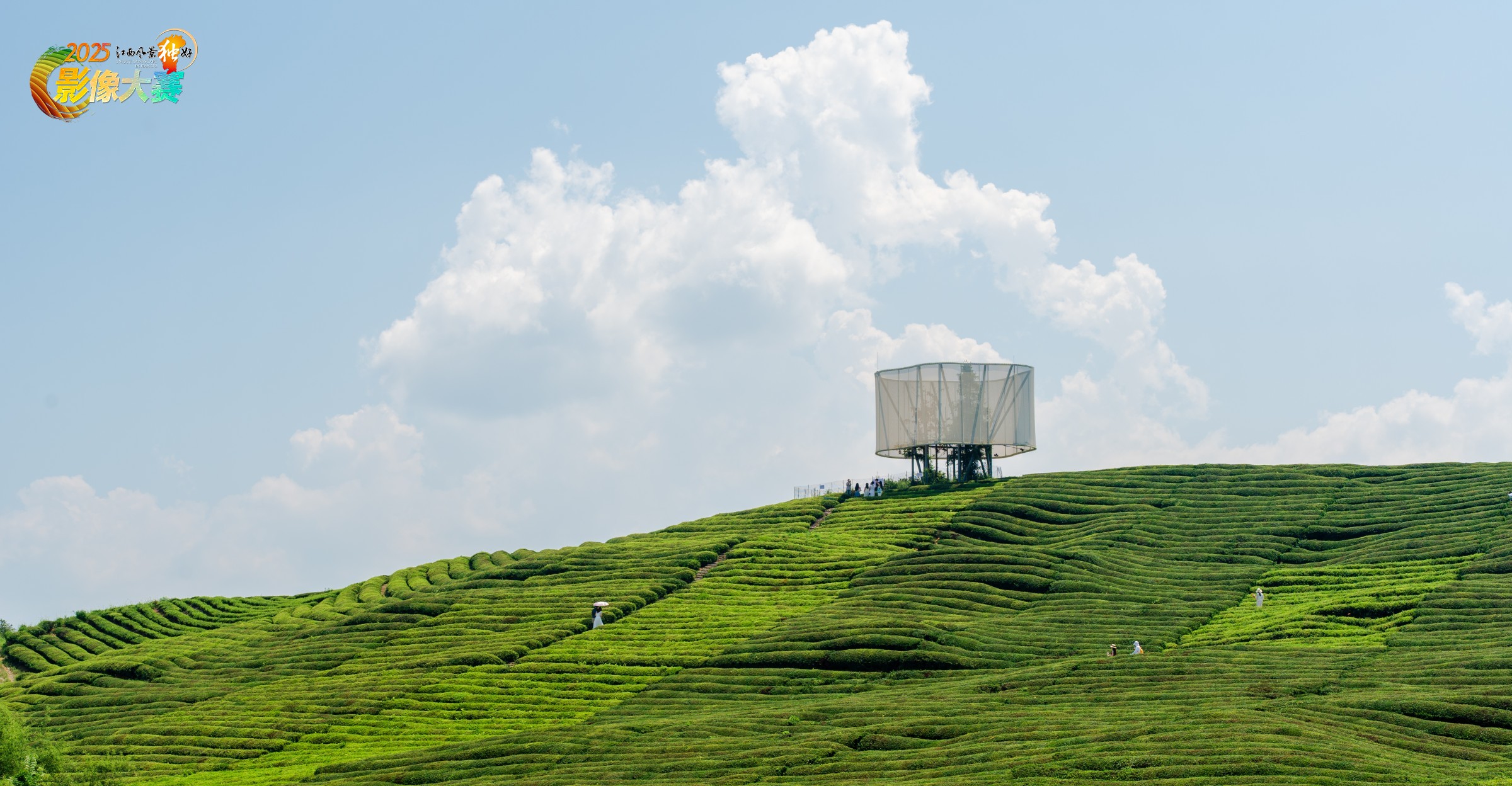 拍摄于景德镇寒溪村茶园大地之灯附近,正午的阳光照在茶园上,游人于茶径中漫步。