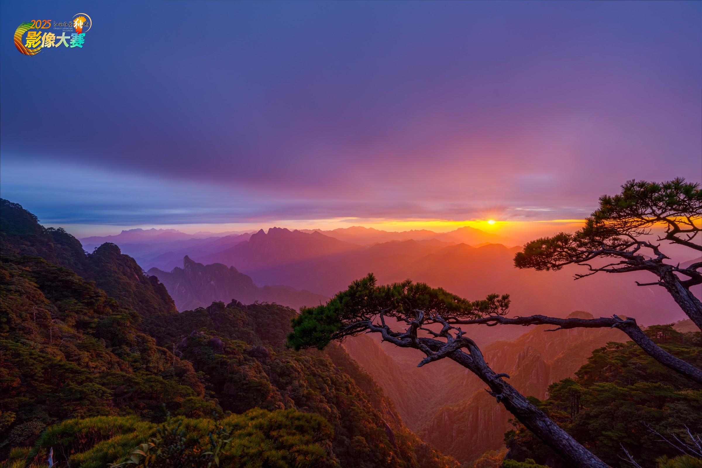 霞光从云层探出,映染了三清山,还有远处的牛角峰、云盖峰、、大茅山、灵山以及更远处的米头尖,都是上饶具有特色的山,全都在一片晚霞下。前景还有三清山西海岸栈道较为独特的松树作为前景。