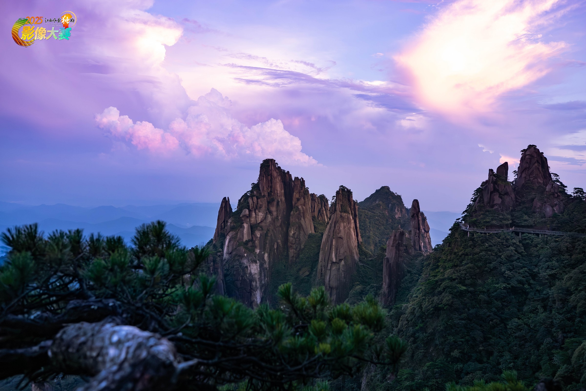 在一次筋疲力尽的攀登后,于三清山的一处回眸,邂逅了这场盛大的晚霞。温暖的夕光为冷峻的花岗岩峰林披上了金色的外衣,翻滚的云海被染成梦幻的粉紫色。前景的松枝,仿佛是我伸出的手臂,共同承接这份自然给予疲惫旅人的最高慰藉。这张照片记录的不仅是世界自然遗产的壮美,更是那一刻,所有辛劳被瞬间抚平,心灵归于宁静的深刻体验。