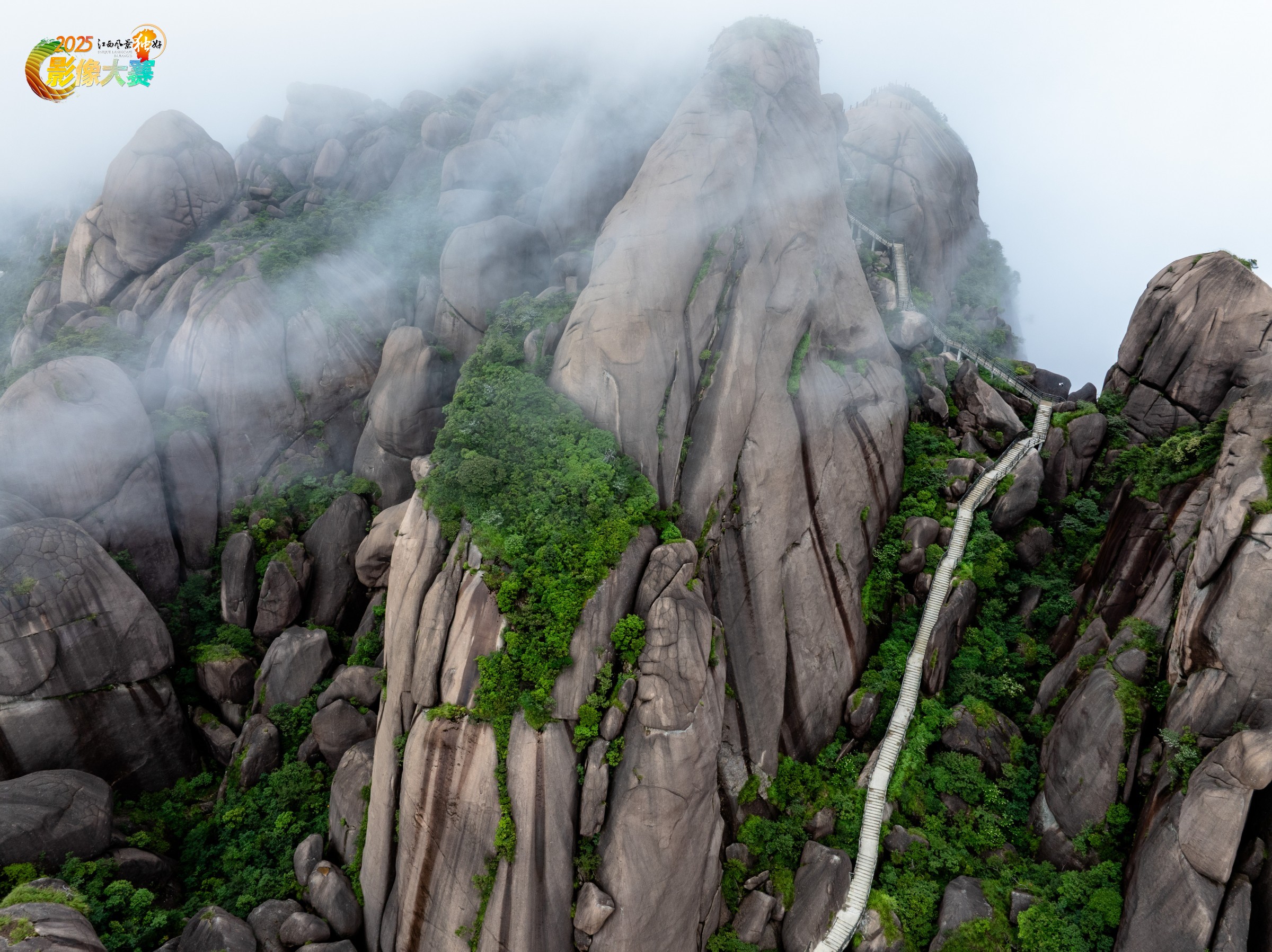 2025年7月22日,江西灵山景区,云雾缭绕,栈道犹如登云梯。
