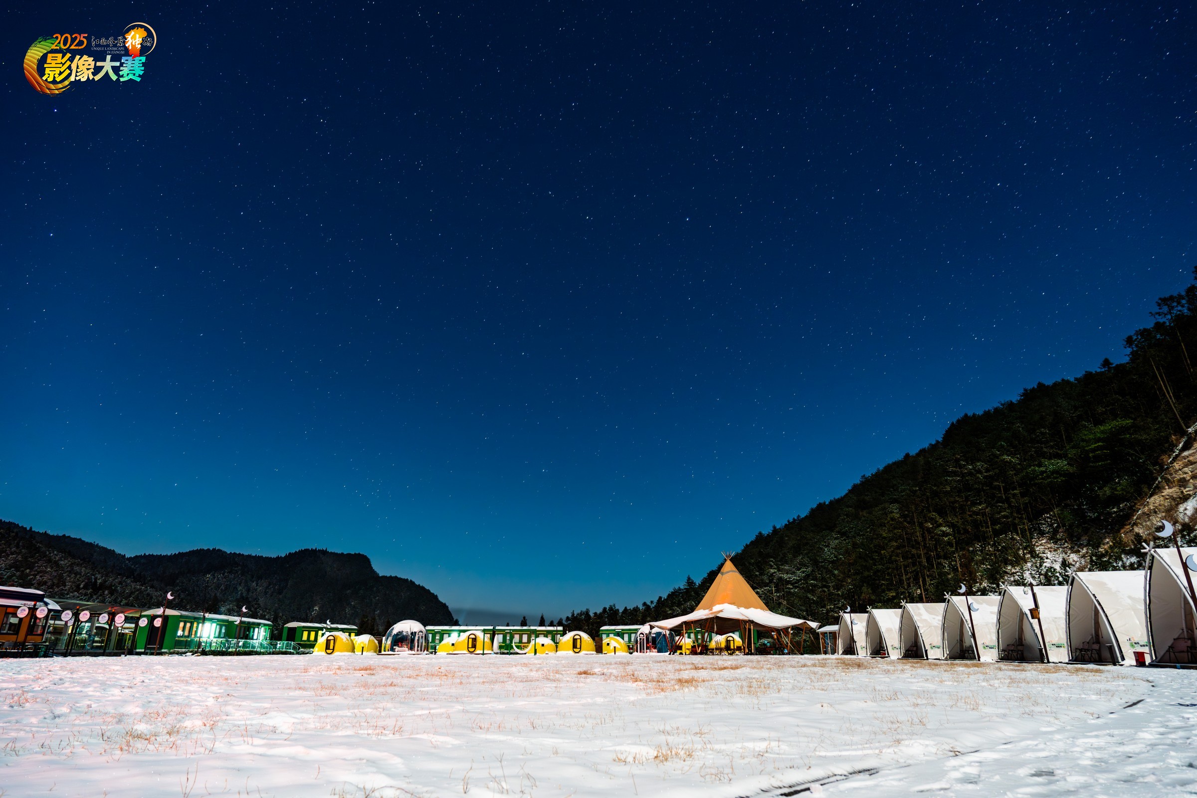 明月山小火车营地被白雪覆盖,夜晚星空闪耀。