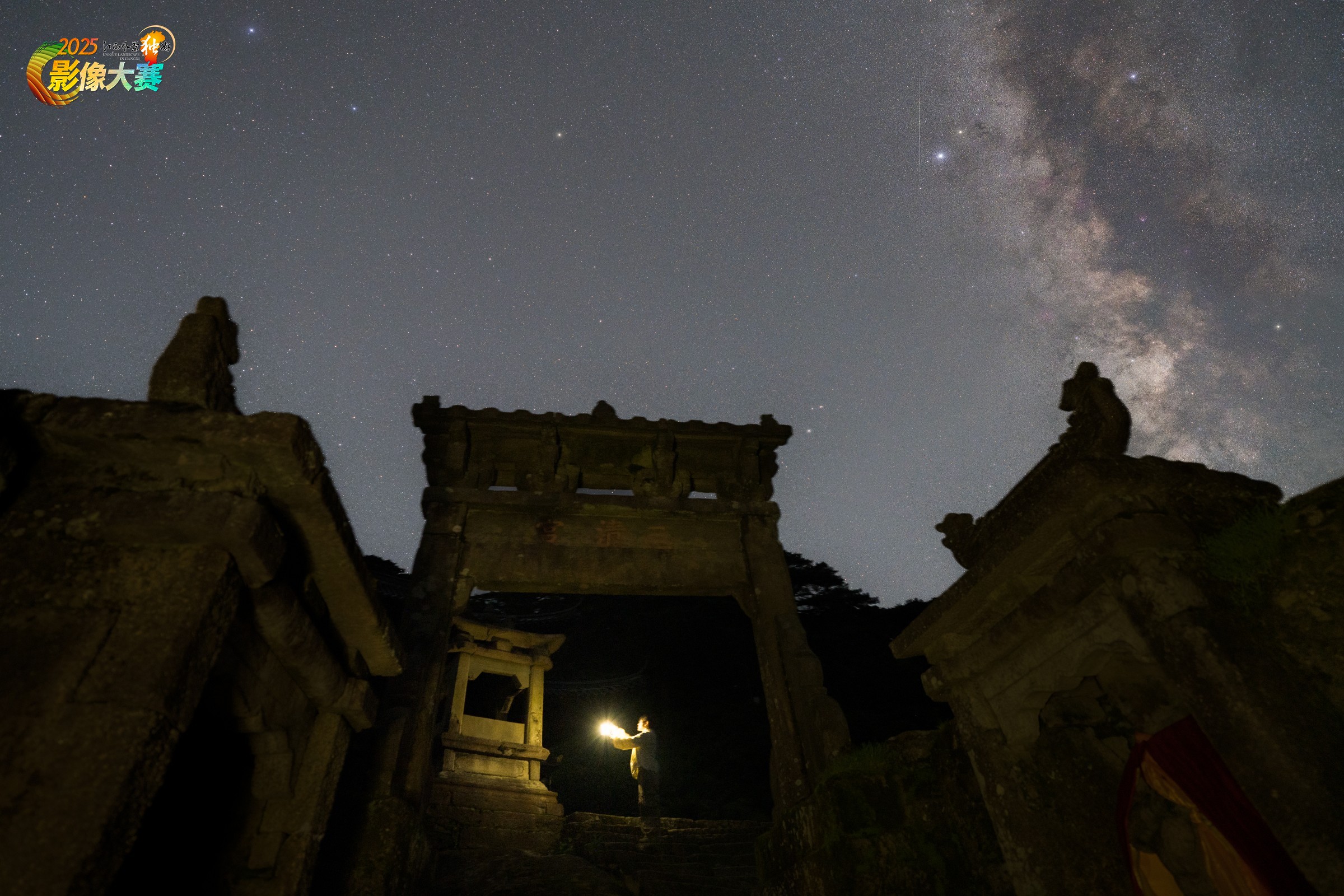 画面中银河如练垂落天宇,古老的道教牌坊(三清山三清宫牌坊)似通幽之阙,人与光在其间相映,既展现星河浩瀚的自然极景,又传递出古建人文与天地宇宙对话的玄远意境。三清宫是三清山道教的标志性建筑,现在所能看到的是明朝景泰年间由王祜重建,距今已有500多年,其位于世界自然遗产中国江西三清山中心区域的山谷盆地,海拔1533米,是三清山厚重人文景观的荟萃福地,也是三清山道教古建筑群的“露天博物馆”。