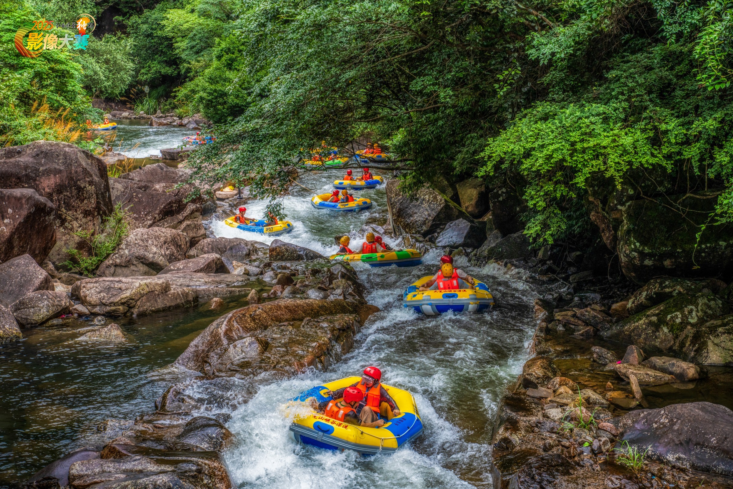 “溪涧飞筏” 描绘出漂流筏在溪涧中如飞般穿梭的动感画面,“欢歌伴浪行” 则体现出漂流者的欢歌与溪流的浪声相伴,营造出欢快且富有韵律的漂流氛围,凸显出活动的愉悦感。